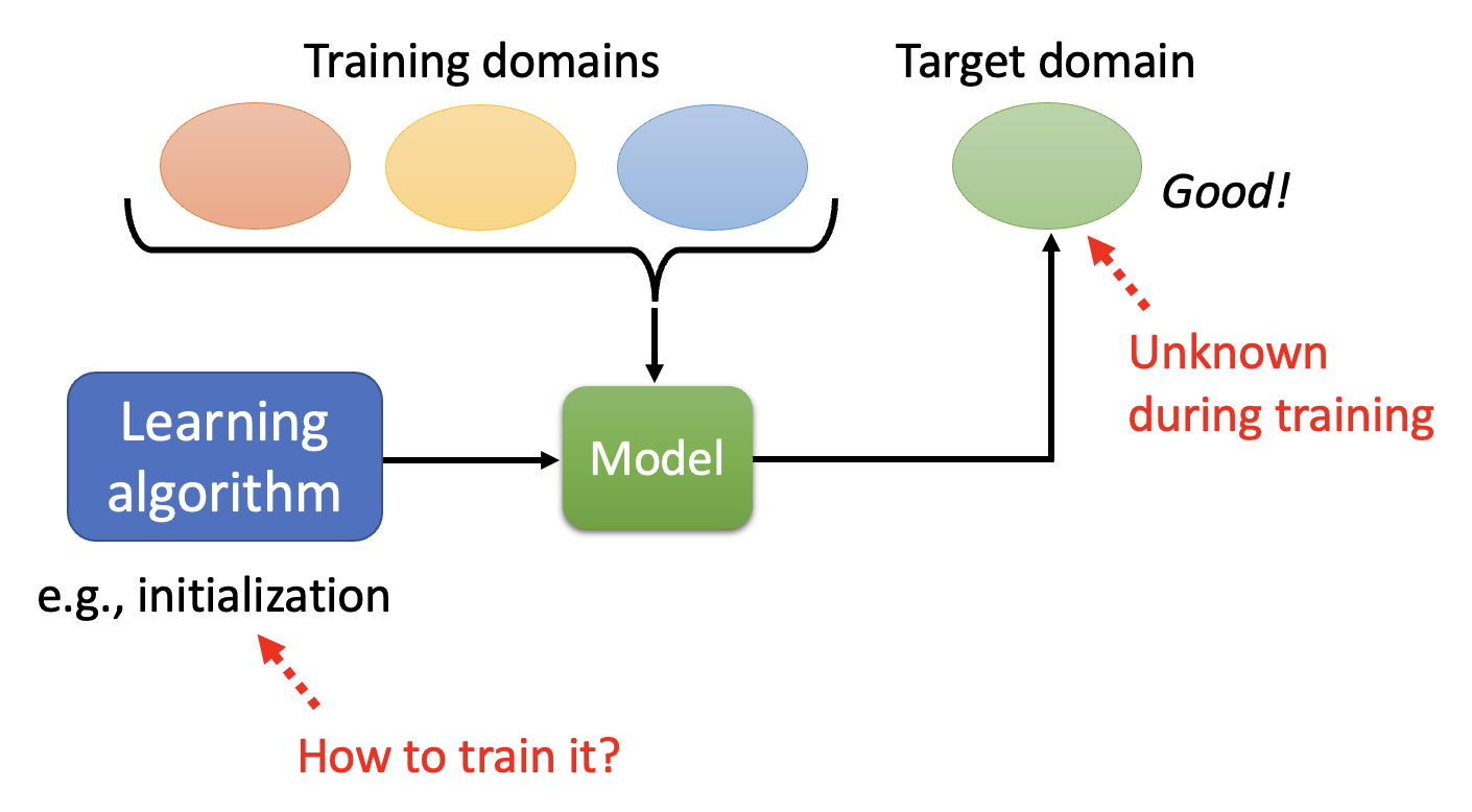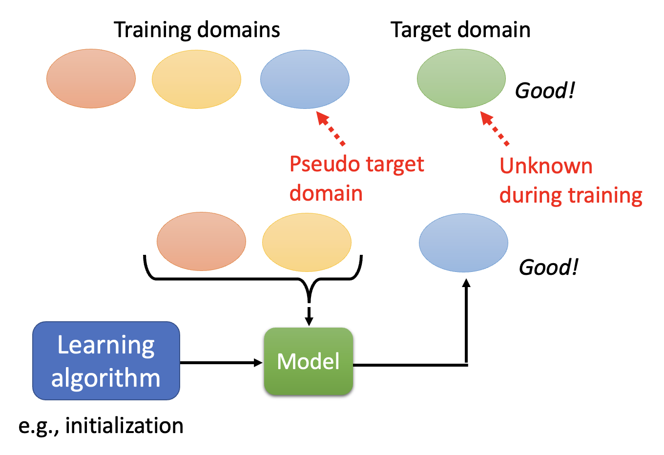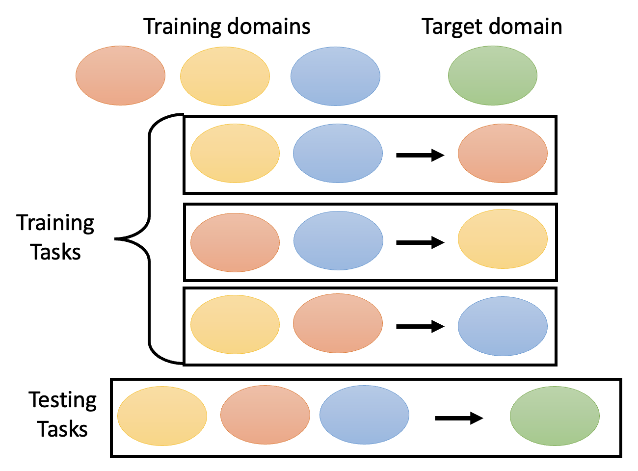 由于在训练时不知道目标域的数据,那我们可以想办法自己构造出一个“目标域数据”——从训练域中划出一部分数据作为假的目标域,模型训练时只参考未被划走的那部分数据,之后模型应当以在假的目标域上取得较好的表现为目标。