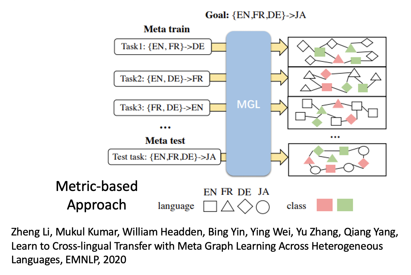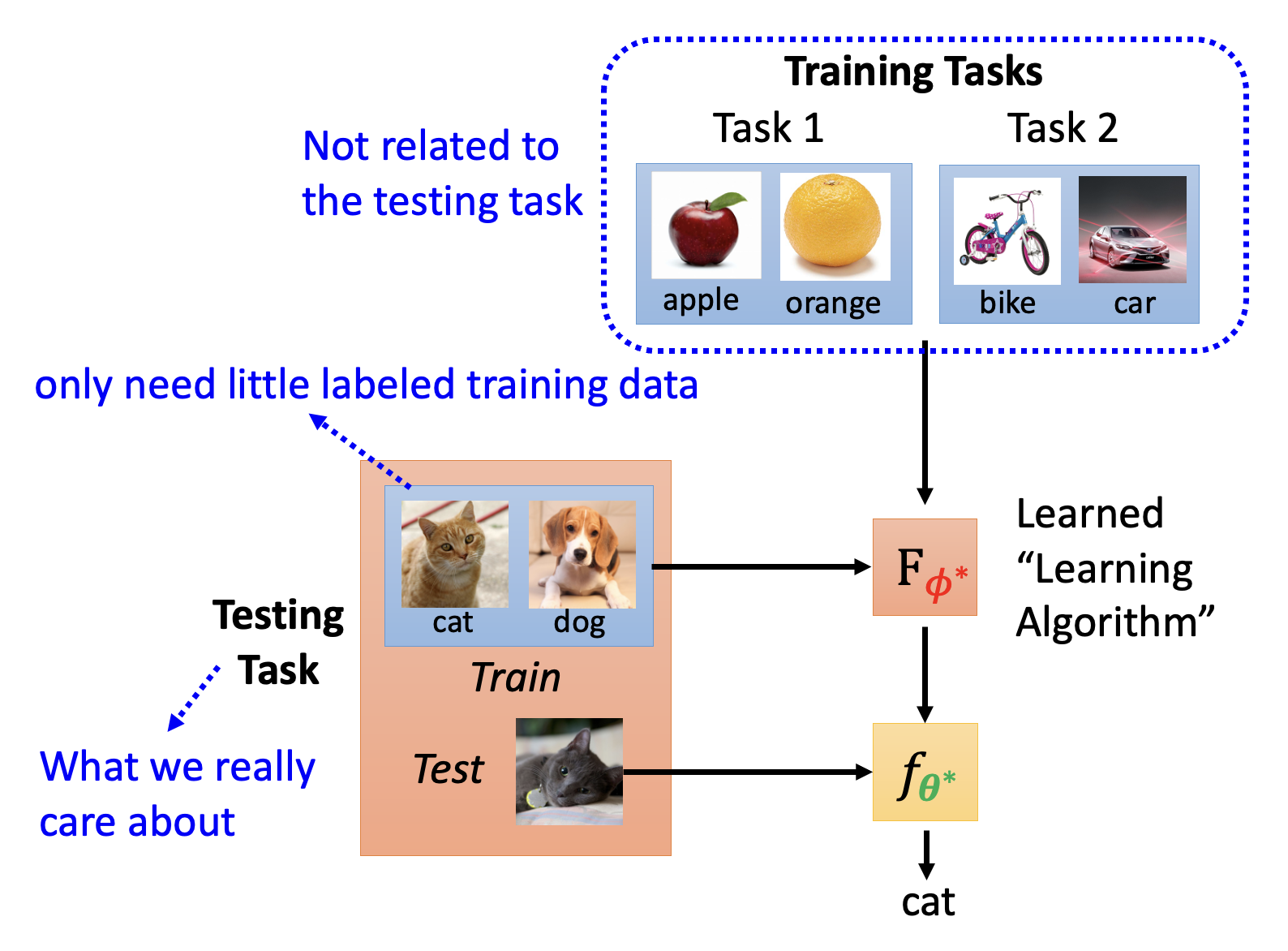 - 测试任务仅需少量标注好的训练数据(和少样本学习(few-shot learning) 类似,而且这个概念常和元学习弄混淆,但两者还是有一定微妙的区别的)