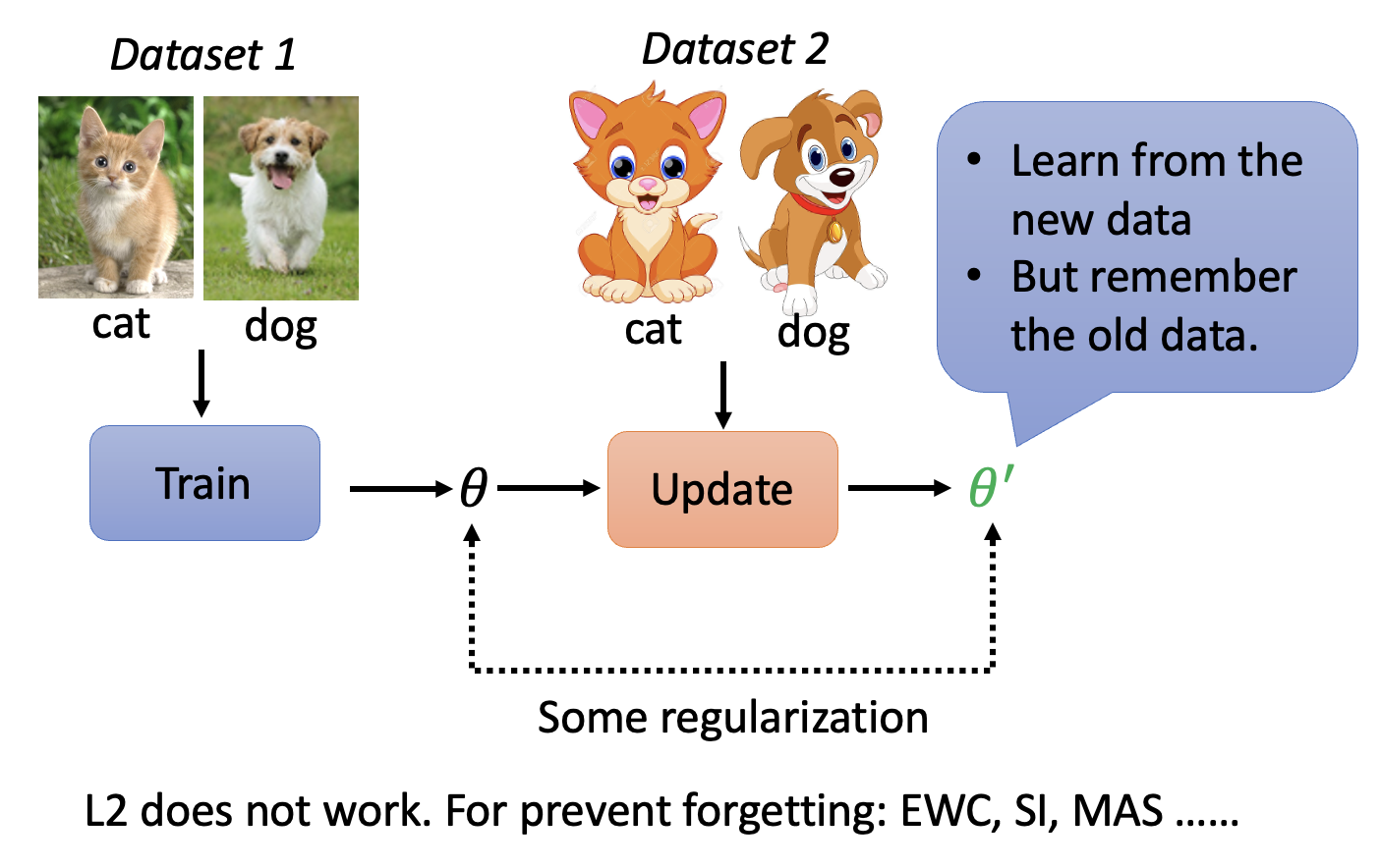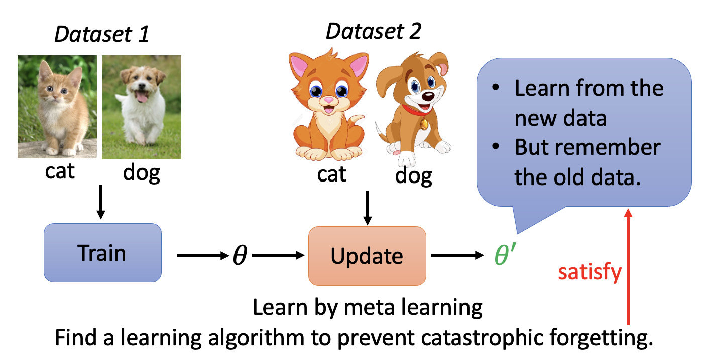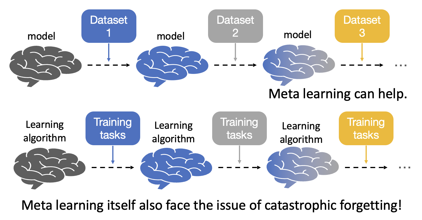 虽然元学习能够为终身学习添一把力,但是元学习自身其实也面临相似的问题——灾难性遗忘!如下图所示,我们将终身学习和元学习的示意图放在一起对比,不难发现元学习中的学习算法也像终身学习的模型那样一个接一个地学习不同的训练任务,那么类似的遗忘问题也会同样存在。