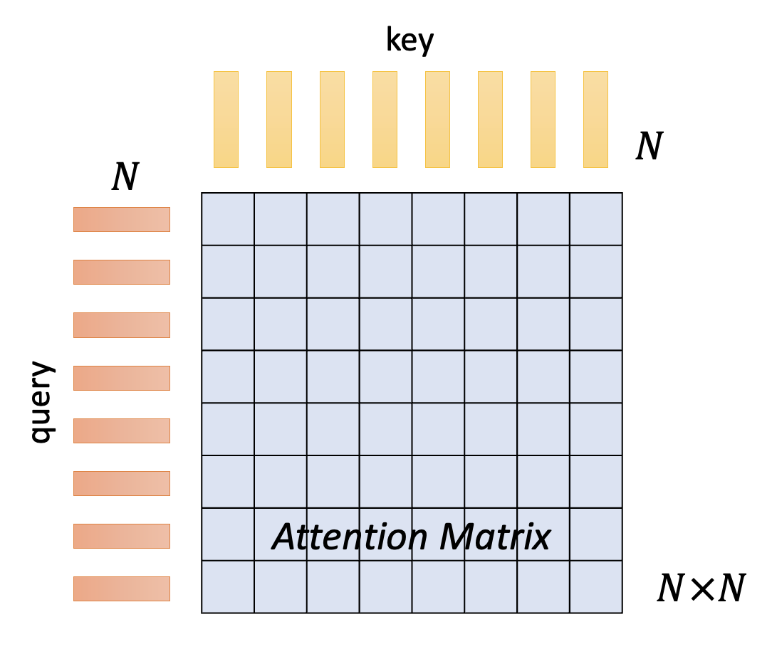 先来回顾一般的自注意机制:假如序列长度为 \(N\),那么中间产生的查询和键的数量也是 \(N\),而查询序列和键序列相乘得到的注意矩阵的规模就是 \(N \times N\) 的了。