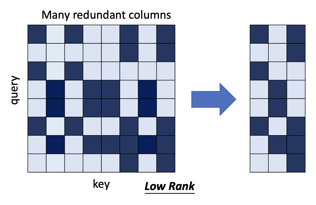 现在来思考一下:我们是否真的需要一个完整的注意矩阵吗?Linformer 这篇论文探讨了这个问题,发现注意矩阵的(rank) 并不大,也就是说不少列是相互依赖的,是冗余的,那么我们可以尝试将这些多余的列删掉,从而减小计算量。