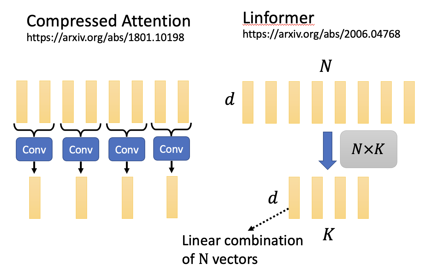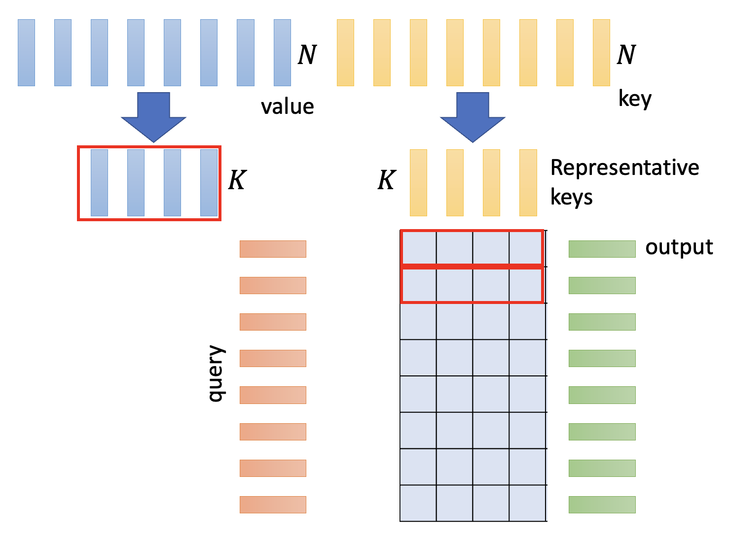 • \(N \times N\) 的注意矩阵和一个 \(N \times K\) 的矩阵相乘,从而得到让键的数量降至 \(K\)