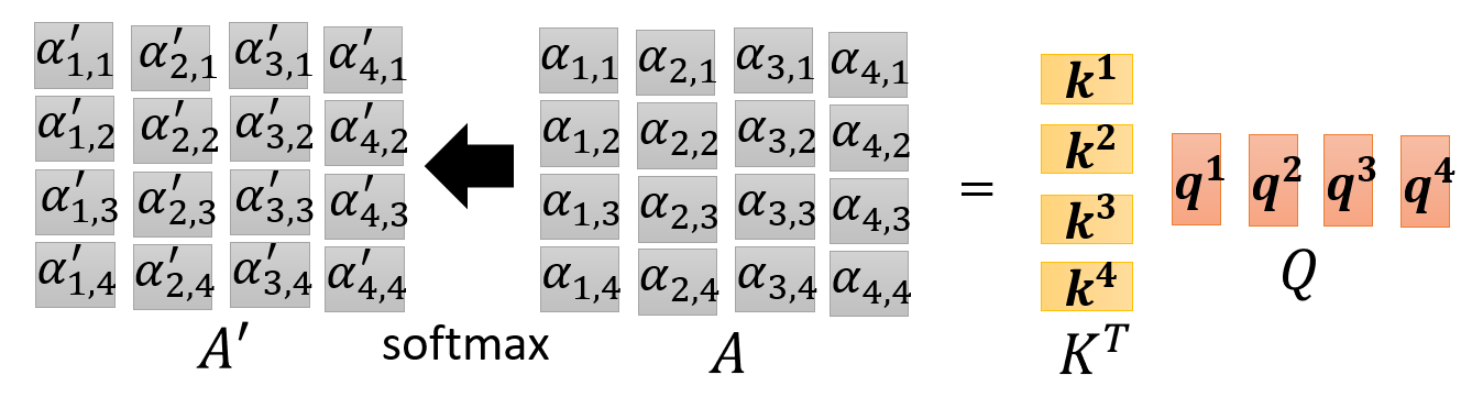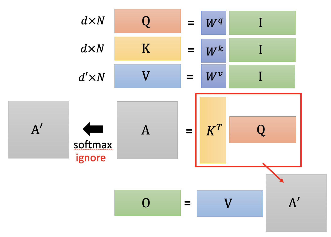 • 我们知道,计算相关程度 \(\alpha\) 的过程是一个向量乘法,但是我们也可以将其转化为一个矩阵乘法,一次性算出所有的相关程度值