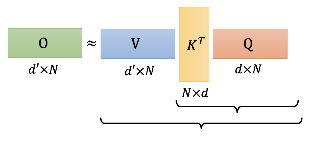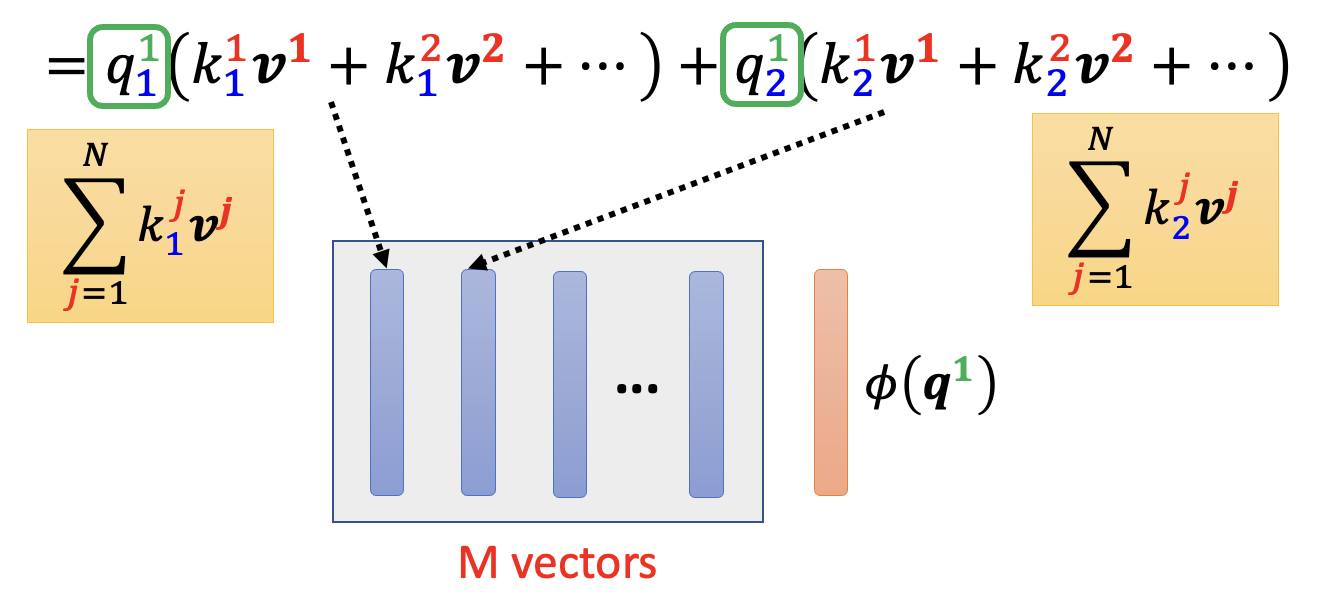 • 对于最后一行公式中的分母部分,还可以进一步转化为: $$ \varphi(\bm{q}^{\textcolor{green}{1}}) \cdot \sum_{\textcolor{cornflowerblue}{j}=1}^N \varphi(\bm{k}^{\textcolor{cornflowerblue}{j}}) $$