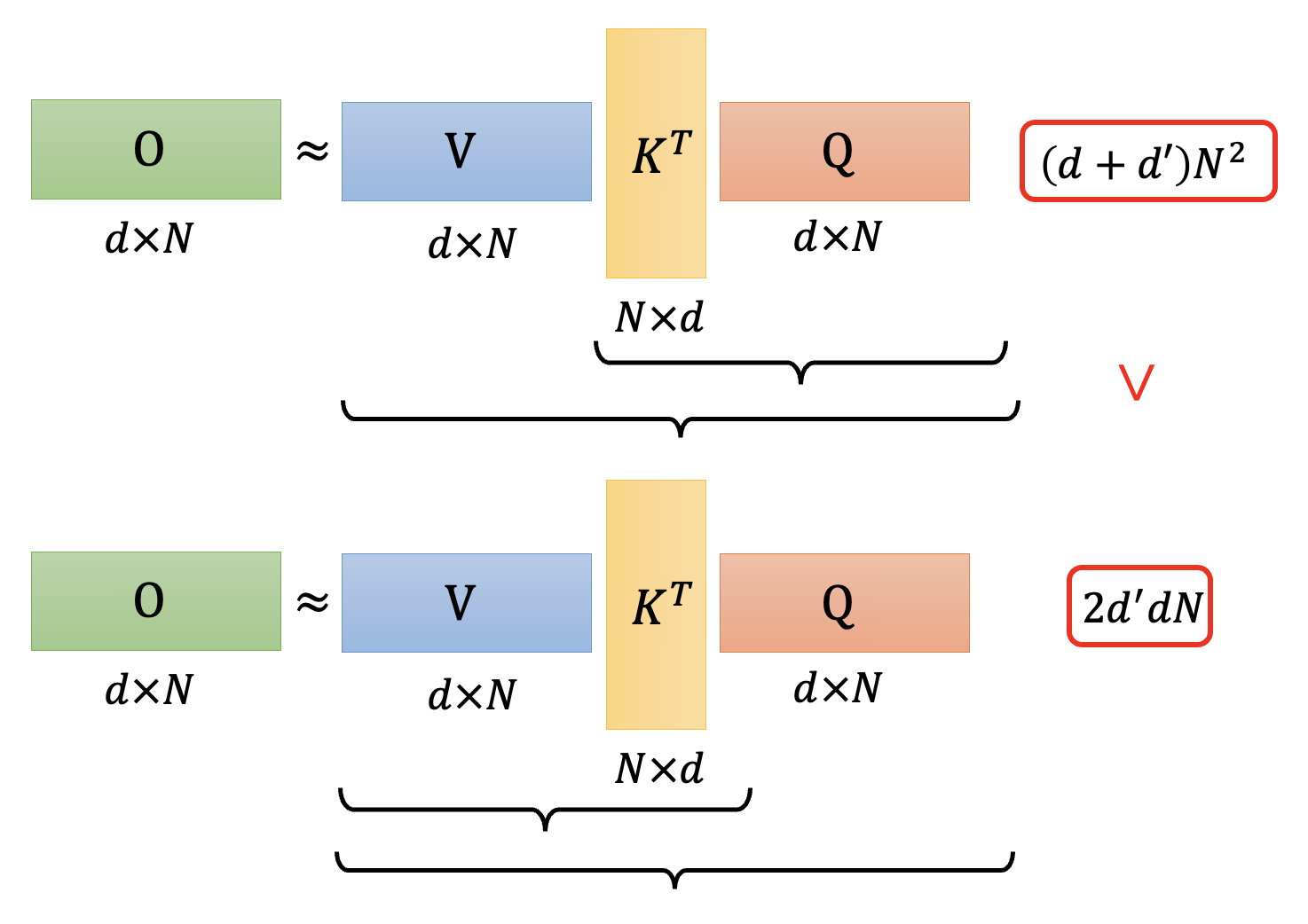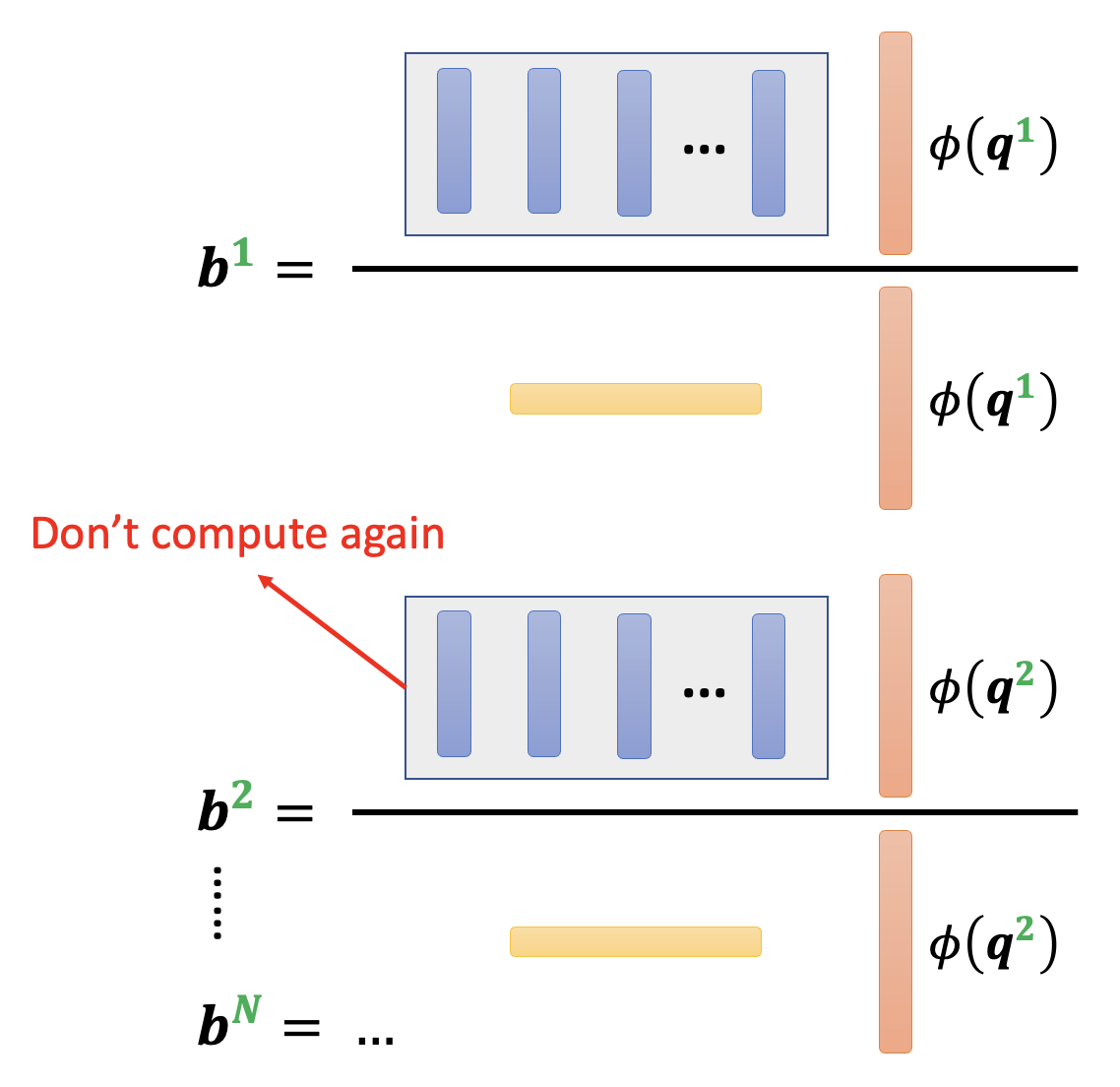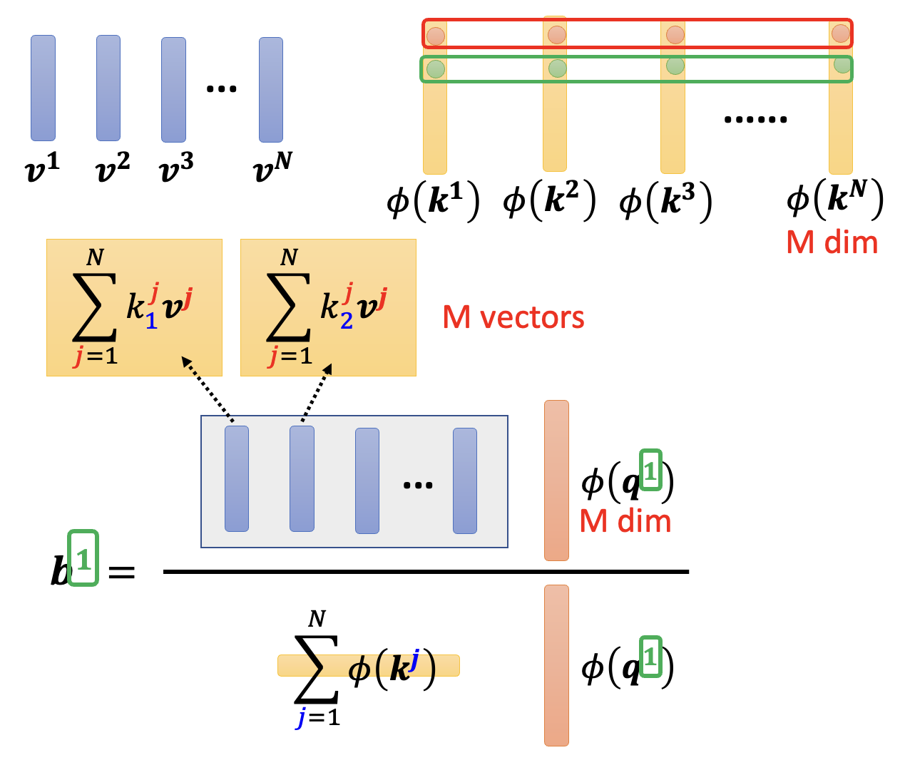 \[ \begin{align} \bm{b}^{\textcolor{green}{1}} = \sum\limits_{\textcolor{red}{i}=1}^N a_{\textcolor{green}{1}, \textcolor{red}{i}=1}' \bm{v}^{\textcolor{red}{i}} & = \sum\limits_{\textcolor{red}{i}=1}^N \dfrac{\exp(\bm{q}^{\textcolor{green}{1}} \cdot \bm{k}^{\textcolor{red}{i}})}{\sum_{\textcolor{cornflowerblue}{j}=1}^N \exp(\bm{q}^{\textcolor{green}{1}} \cdot \bm{k}^{\textcolor{cornflowerblue}{j}})} \bm{v}^{\textcolor{red}{i}} \notag \\ & = \sum\limits_{\textcolor{red}{i}=1}^N \dfrac{\varphi(\bm{q}^{\textcolor{green}{1}}) \cdot \varphi(\bm{k}^{\textcolor{red}{i}})}{\sum_{\textcolor{cornflowerblue}{j}=1}^N \varphi(\bm{q}^{\textcolor{green}{1}}) \cdot \varphi(\bm{k}^{\textcolor{cornflowerblue}{j}})} \bm{v}^{\textcolor{red}{i}} \notag \\ & = \dfrac{\sum\limits_{\textcolor{red}{i}=1}^N [\varphi(\bm{q}^{\textcolor{green}{1}}) \cdot \varphi(\bm{k}^{\textcolor{red}{i}})] \bm{v}^{\textcolor{red}{i}}}{\sum_{\textcolor{cornflowerblue}{j}=1}^N \varphi(\bm{q}^{\textcolor{green}{1}}) \cdot \varphi(\bm{k}^{\textcolor{cornflowerblue}{j}})} \notag \end{align} \]