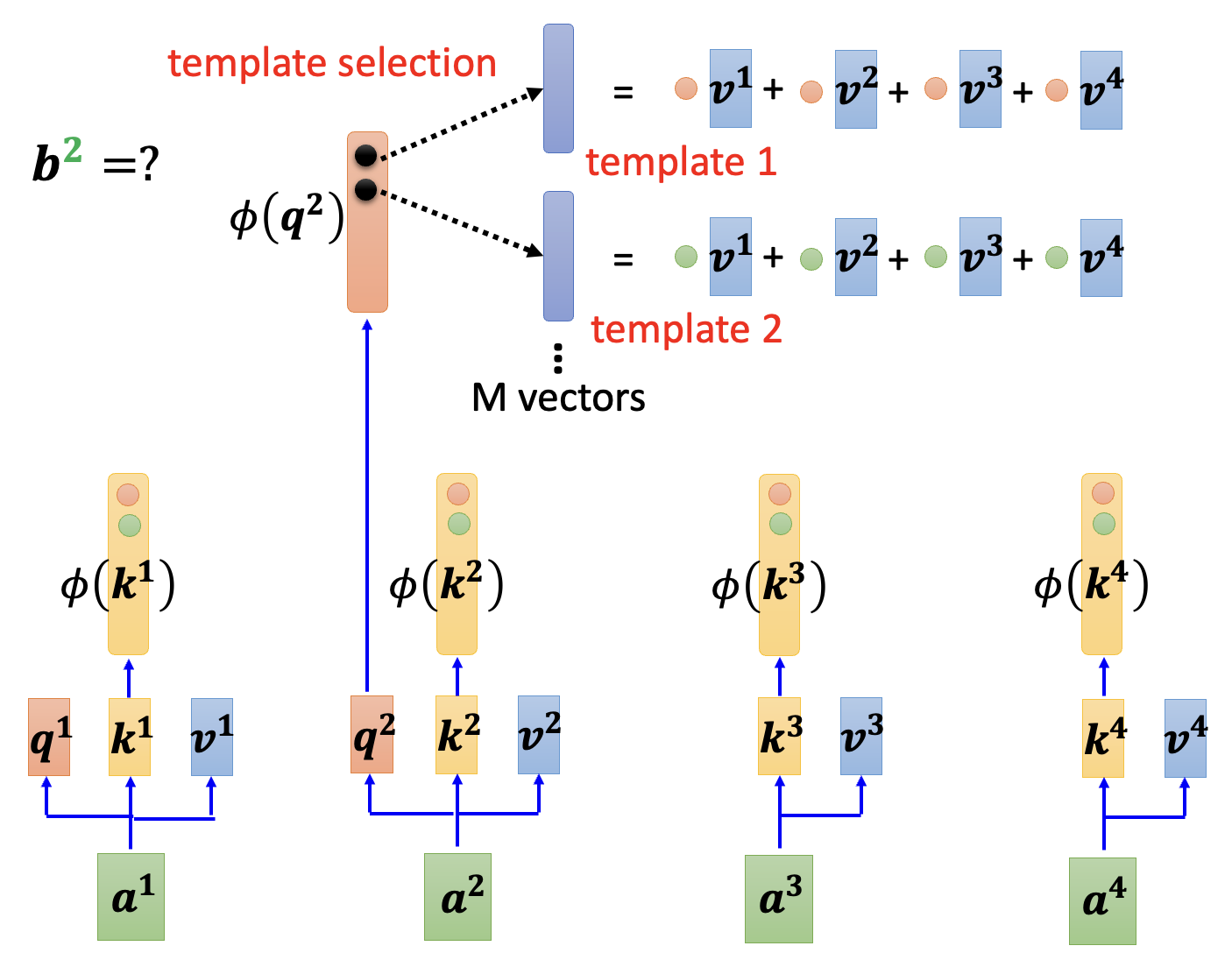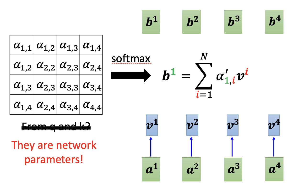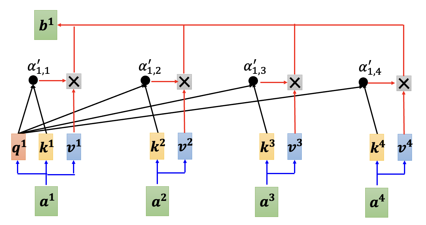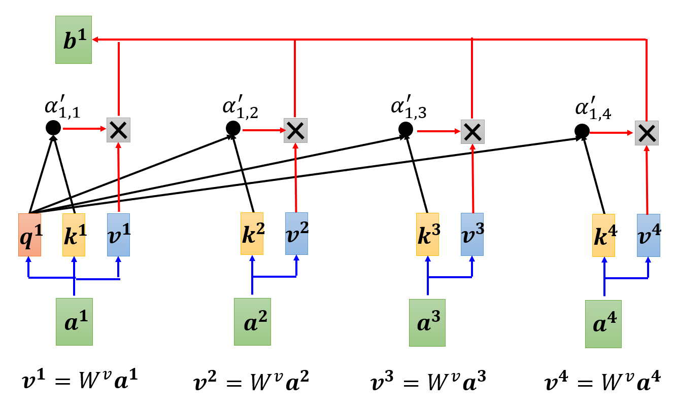 \[ \bm{b}^{\textcolor{green}{1}} = \sum\limits_{\textcolor{red}{i}=1}^N a_{\textcolor{green}{1}, \textcolor{red}{i}=1}' \bm{v}^{\textcolor{red}{i}} = \sum\limits_{\textcolor{red}{i}=1}^N \dfrac{\exp(\bm{q}^{\textcolor{green}{1}} \cdot \bm{k}^{\textcolor{red}{i}})}{\sum_{\textcolor{cornflowerblue}{j}=1}^N \exp(\bm{q}^{\textcolor{green}{1}} \cdot \bm{k}^{\textcolor{cornflowerblue}{j}})} \bm{v}^{\textcolor{red}{i}} \]