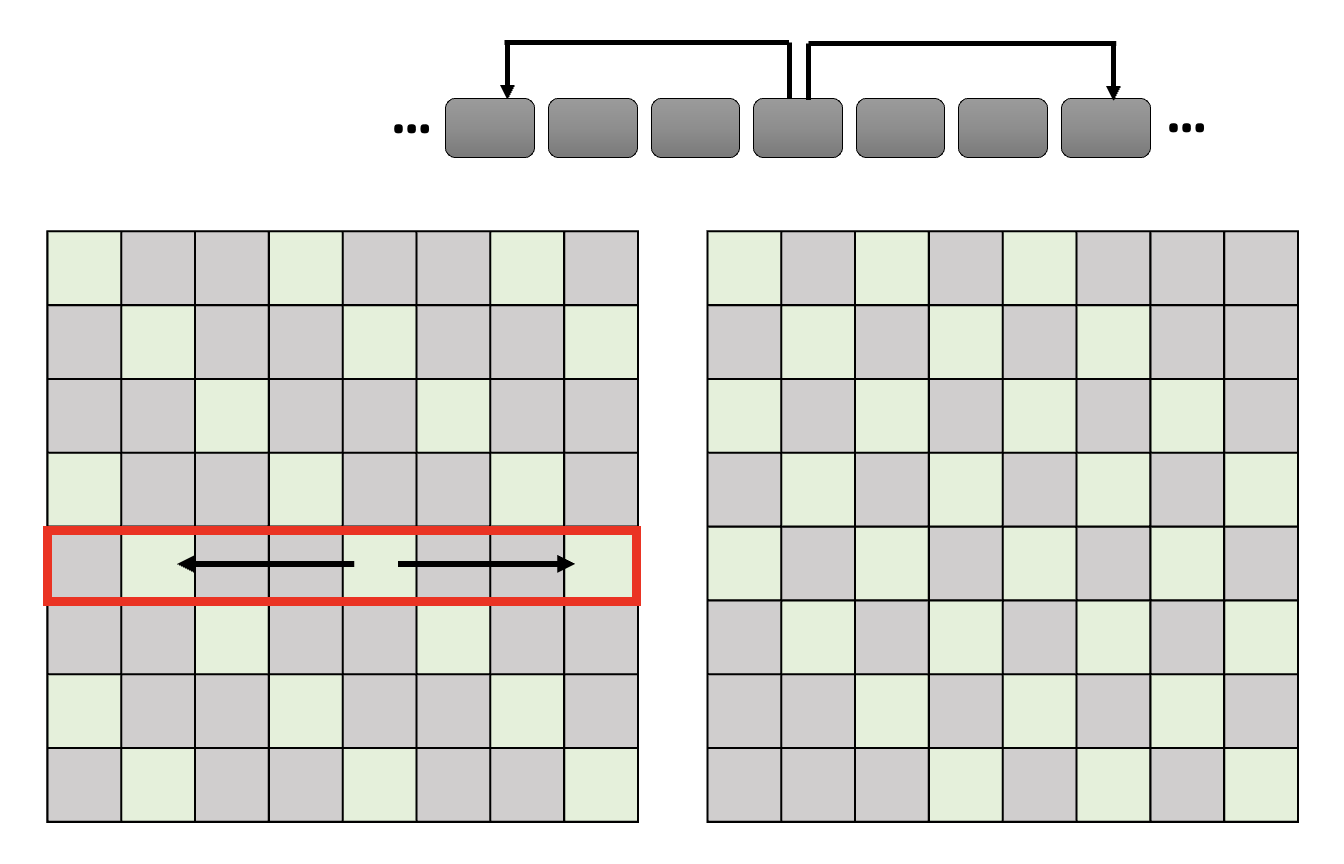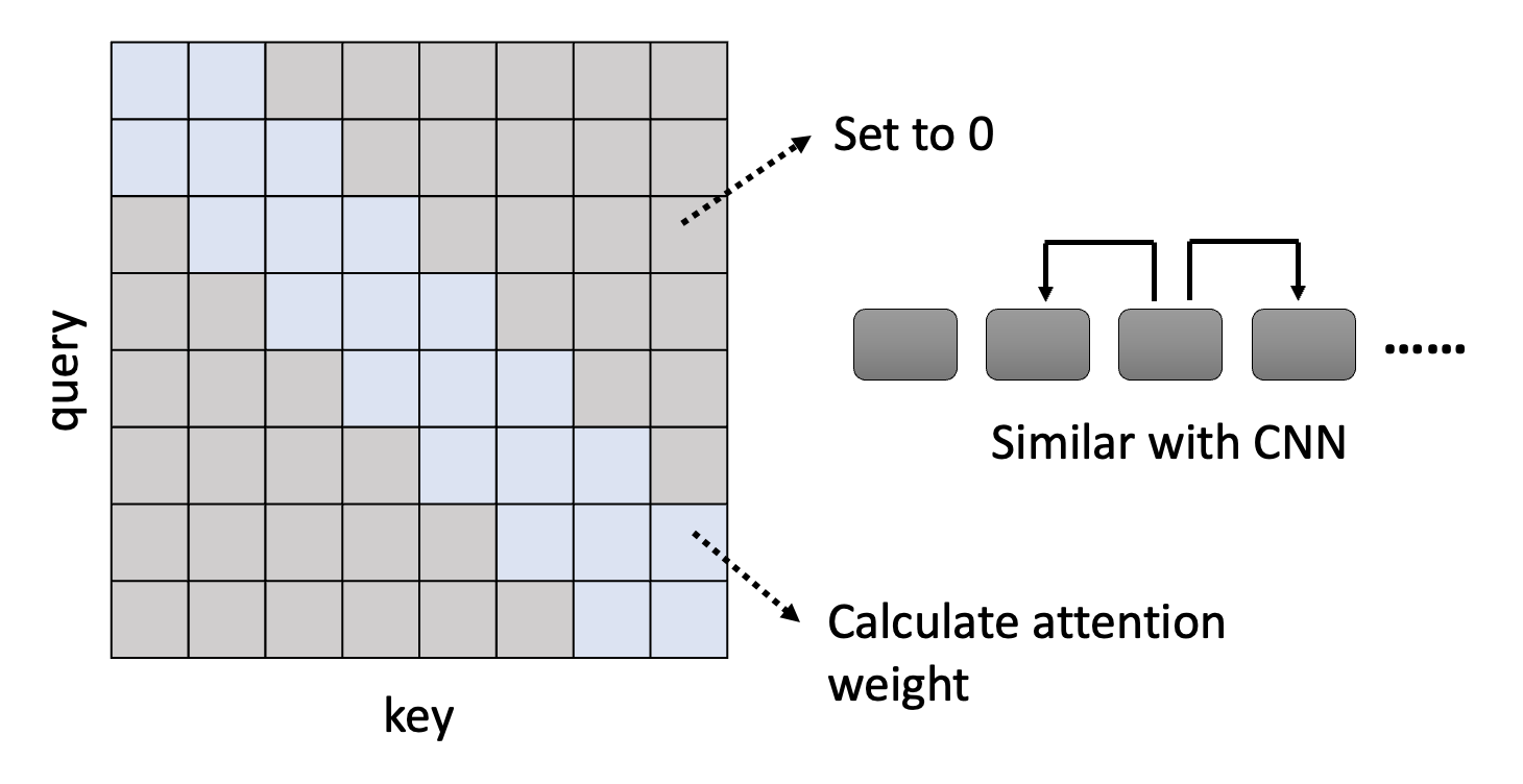 • 注意矩阵中灰色方块对应的元素直接置 0,不去计算;蓝色方块对应的元素需要计算注意权重