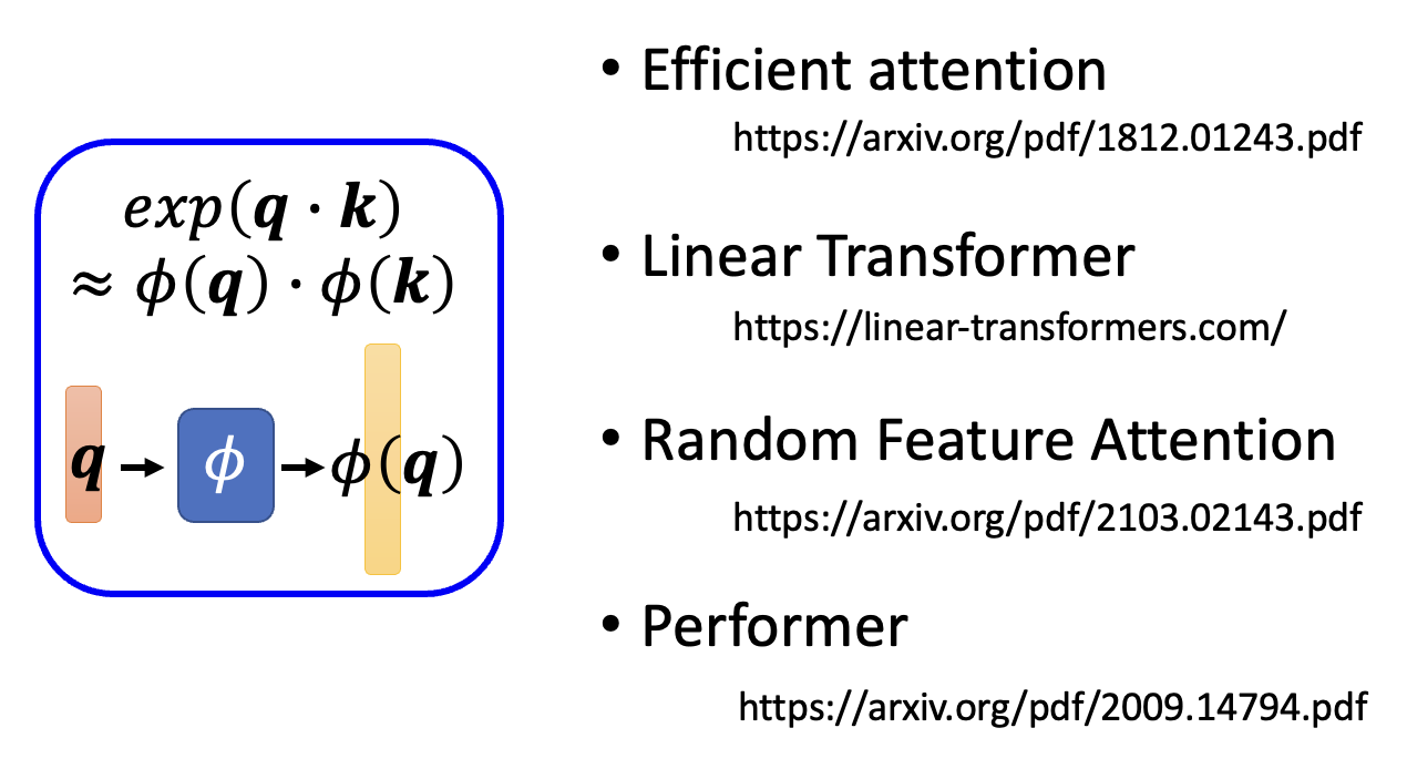 • 第一行到第二行,我们用了这样的公式: $$ \exp(\bm{q} \cdot \bm{k}) \approx \varphi(\bm{q}) \cdot \varphi(\bm{k}) $$