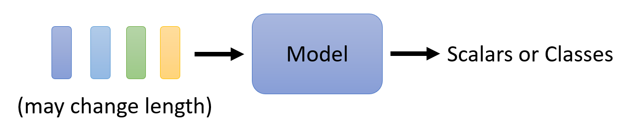 之前我们介绍的模型,都只是将一个向量作为输入(比如 COVID-19 感染人数预测、图像处理等问题,输出的是一个标量(回归问题)或类(分类问题。而现在我们将要讨论这样的一个模型:将一组向量(向量序列)作为输入,输出的是多个标量或类;而且输入向量的个数是可变的。