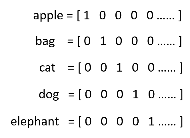• 独热编码(one-hot encoding):假如所有单词的个数为 n,那么我们就用一个大小为 n 的向量来表示每个单词,每个位置上的元素表示唯一的单词