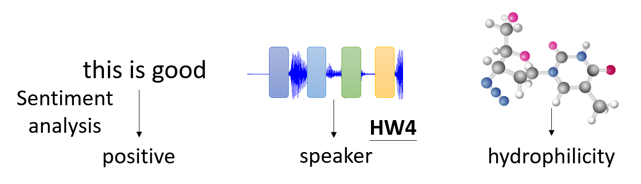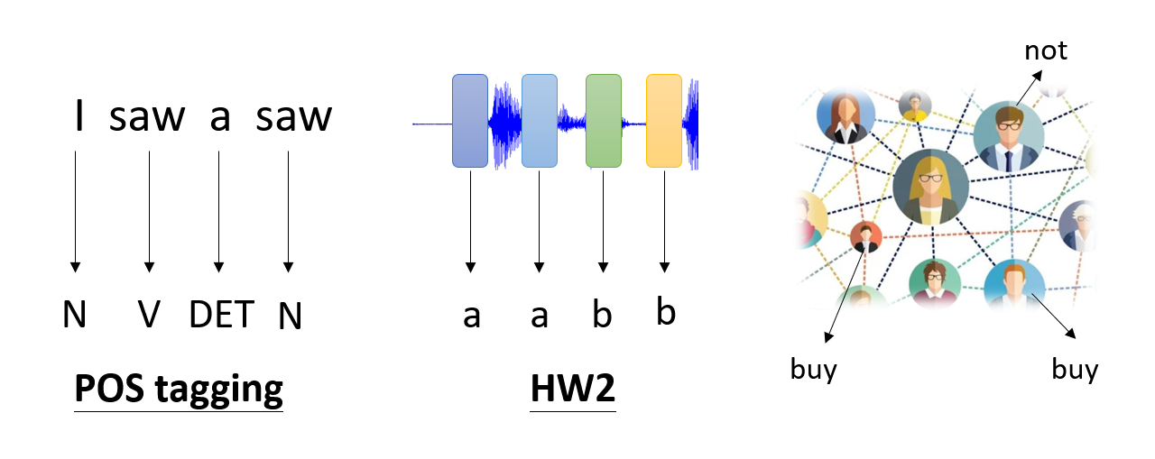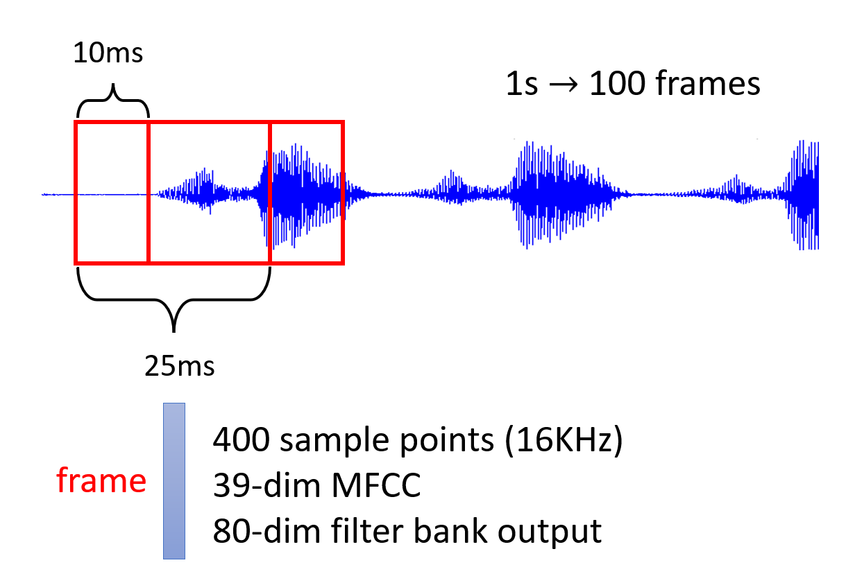 在机器学习课程 HW2 中,我们将语音看作一段段的帧(25ms 的语音;并且用一个滑动窗口来划分帧,窗口每次移动的步幅为 10ms,所以 1s 的语音里就有 100 个帧。因此,每个帧就是一个向量,而一段语音就是变长的向量序列。