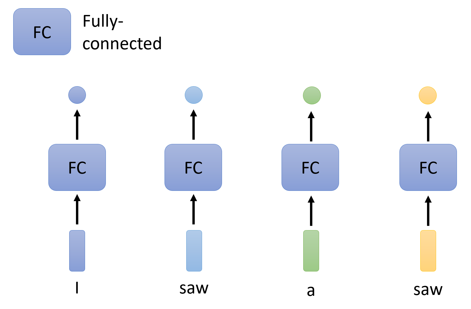 显然,这样有一个很大的缺陷:我们没有考虑到向量序列各个向量之间的联系,各个向量都是“各自为政”的。所以,如果有两个向量的值是相等的,那就会被视为意义相同的两个东西,从而产生两个相同的输出。