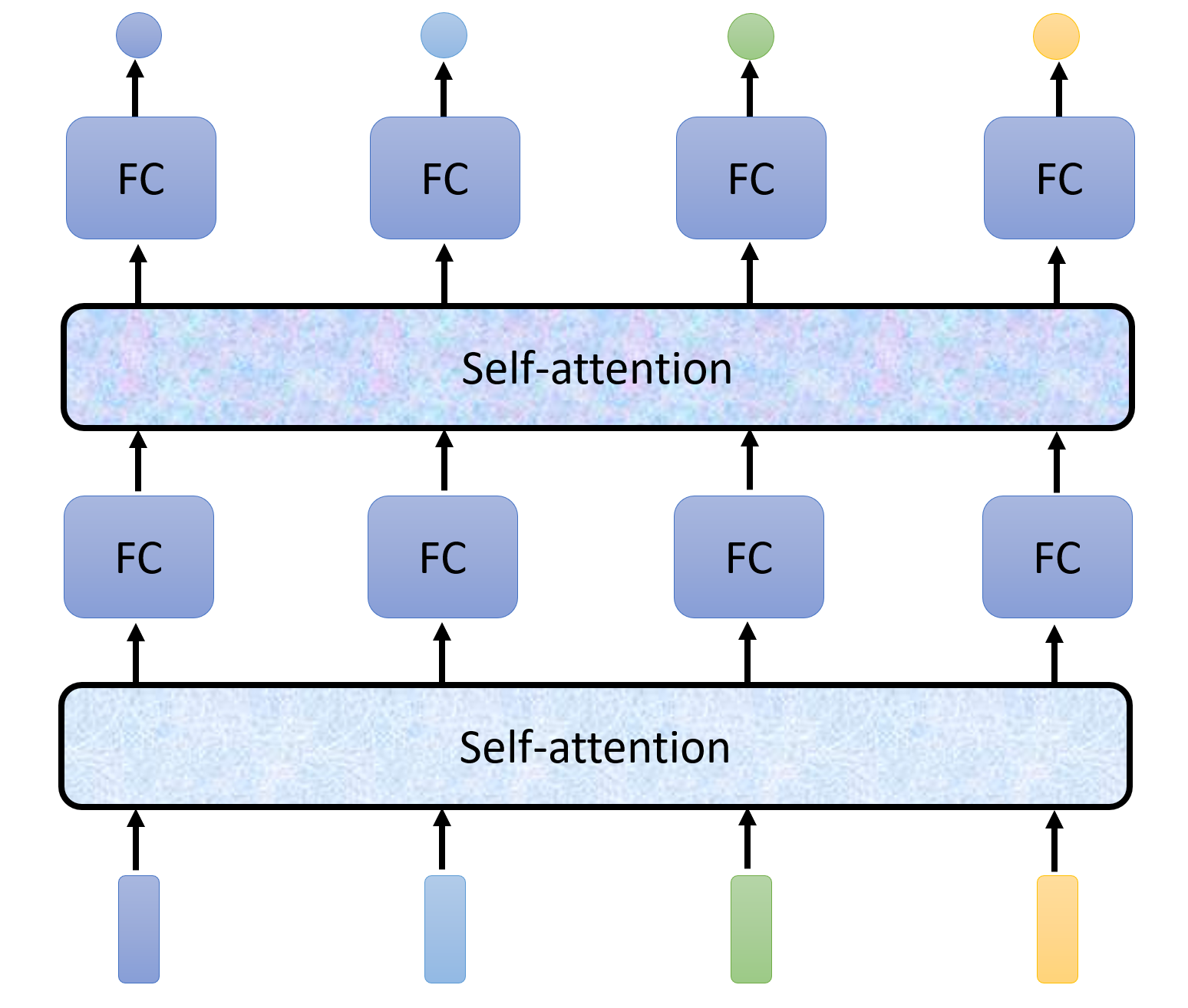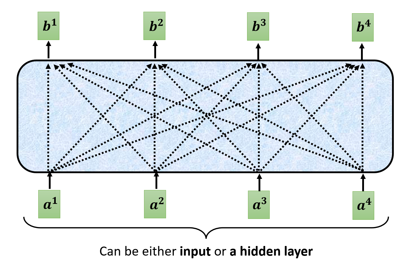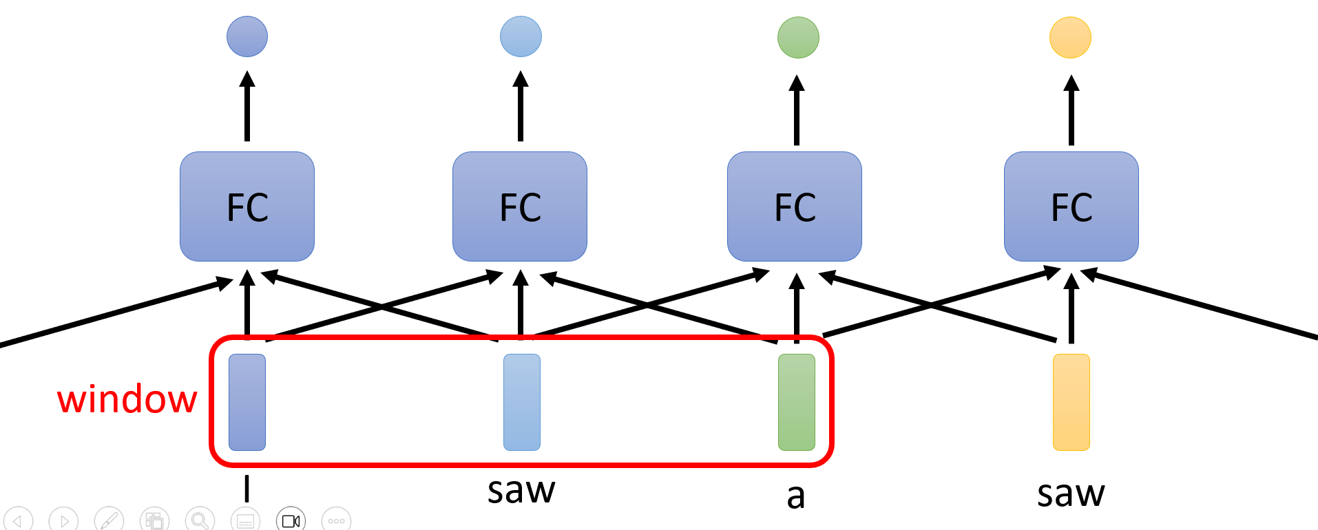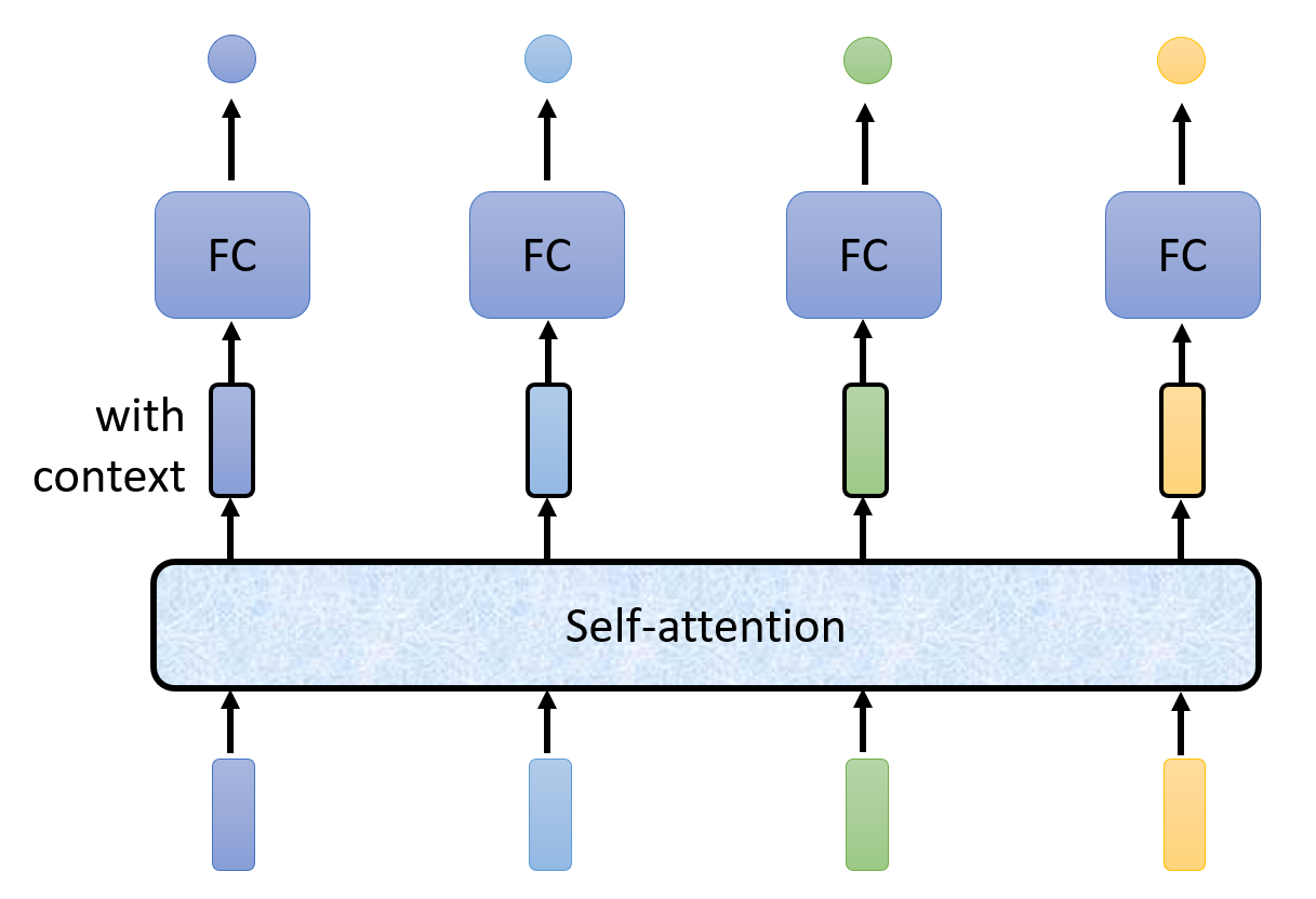 每个向量输入都有一个对应的全连接层,这个全连接层不仅应该接收对应的向量输入,同时也要顾及整个上下文(context) 中的向量。