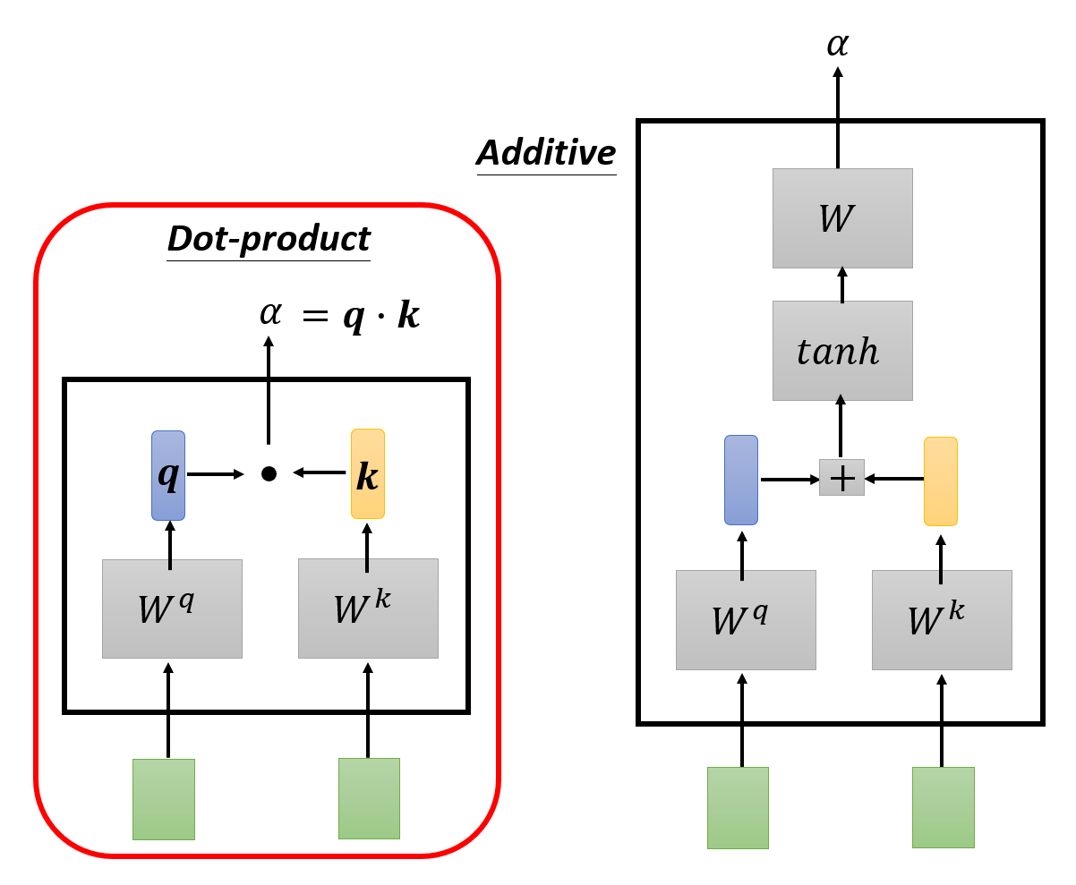 • 加法 (additive):将 \(\bm{q} + \bm{k}\) 的结果丢给 \(\tanh\) 函数计算,然后再经过一次转换(用矩阵 \(W\) 表示)得到 \(\alpha\)