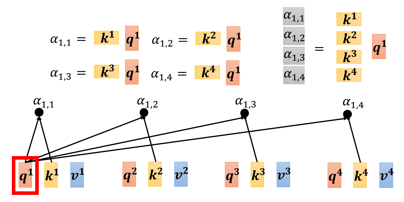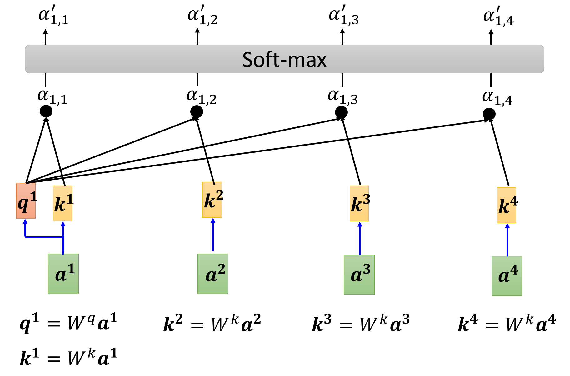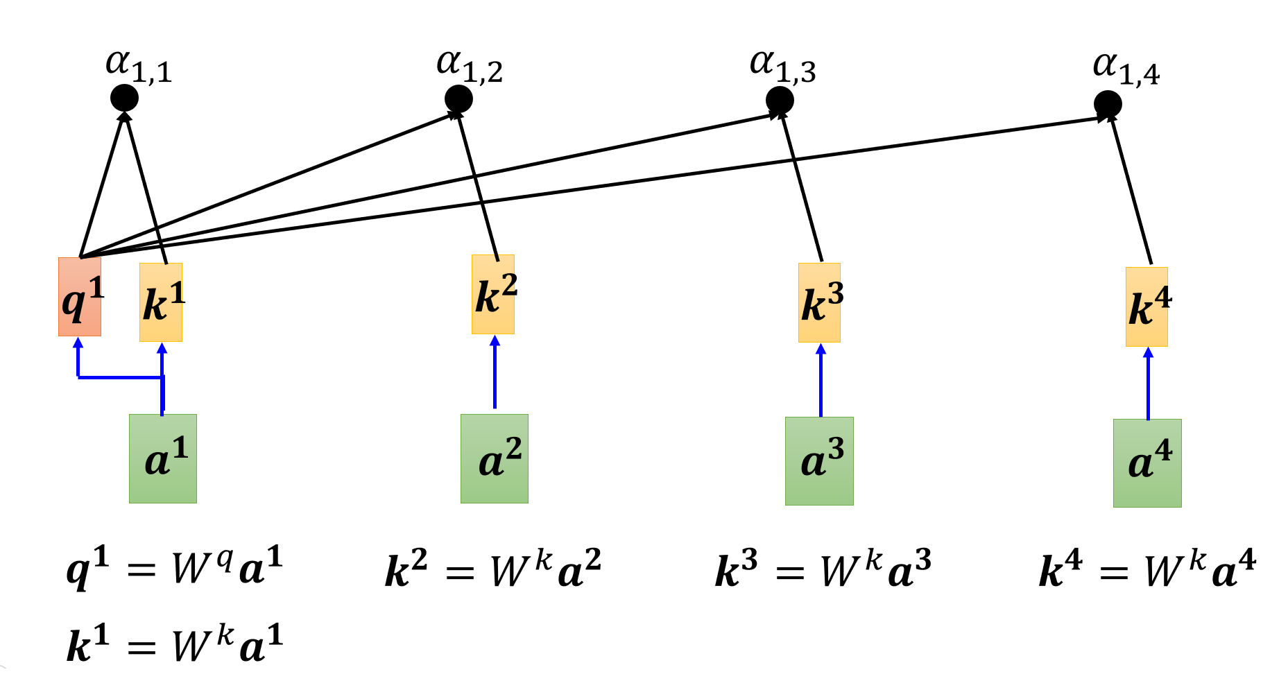 回到前面有 4 个输入的例子,先将 \(\bm{a^1}\) 作为查询,其他几个输入向量(也可以包括 \(\bm{a^1}\))作为键,计算相关程度 \(\alpha_{1, j}\ (j = 1, \dots, 4)\)