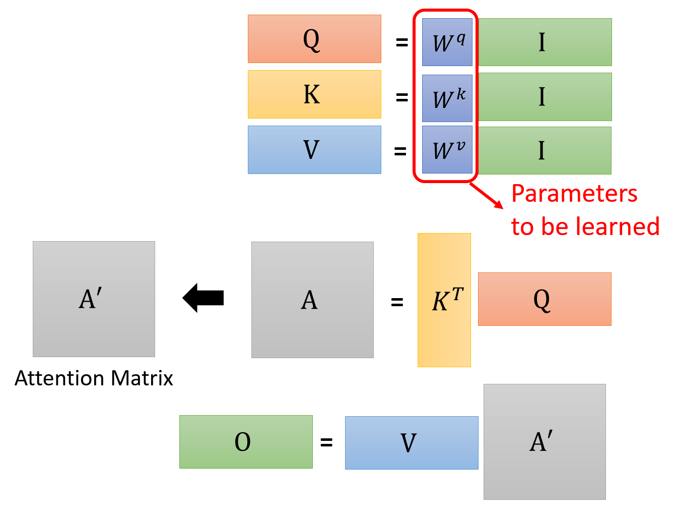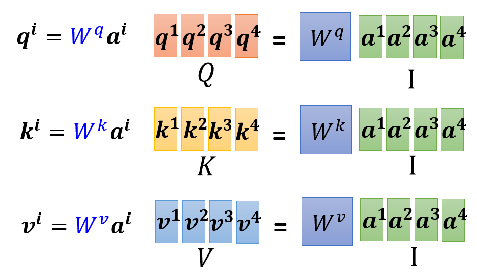 • 对于每个输入向量 \(\bm{a^i}\),需要得到三个向量 \(\bm{q^i}, \bm{k^i}, \bm{v^i}\),而这些向量分别通过三个矩阵 \(W^q, W^k, W^v\) \(\bm{a^i}\) 相乘得到。与其让矩阵分别和单个的输入向量相乘,不如将这些向量拼在一起,形成一个矩阵,这样就将多次的矩阵 \(\times\) 向量的运算转化为一次的矩阵 \(\times\) 矩阵的运算,如下所示: