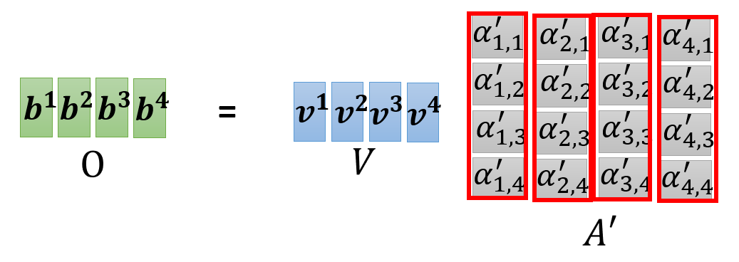 • 同理,将所有的向量 \(\bm{v}\) 拼在一起,与相关程度构成的矩阵 \(A'\) 相乘,得到所有的输出向量: