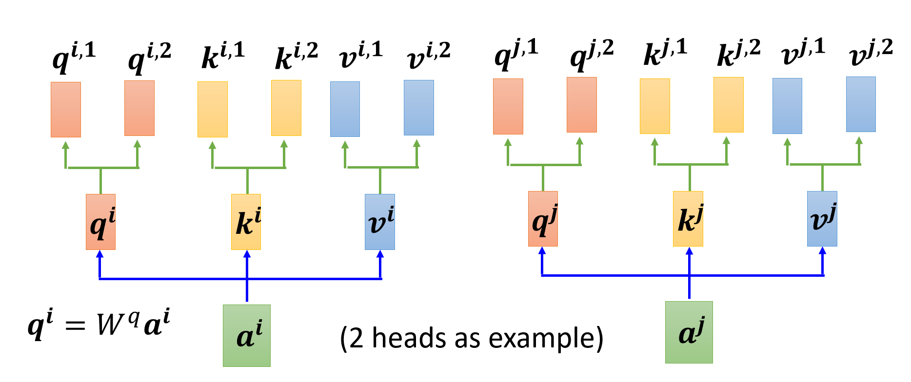 对于那些需要学习的参数 \(\bm{q}, \bm{k}, \bm{v}\),我们可以将同一个参数拆成多份(即“多个头”(multi-head),通过原参数 x 不同的矩阵得到,每个“头”考虑不同的相关性类型,从而能够捕获更复杂的关系,提高模型对复杂模式的理解。下图就是头数 = 2 的例子: