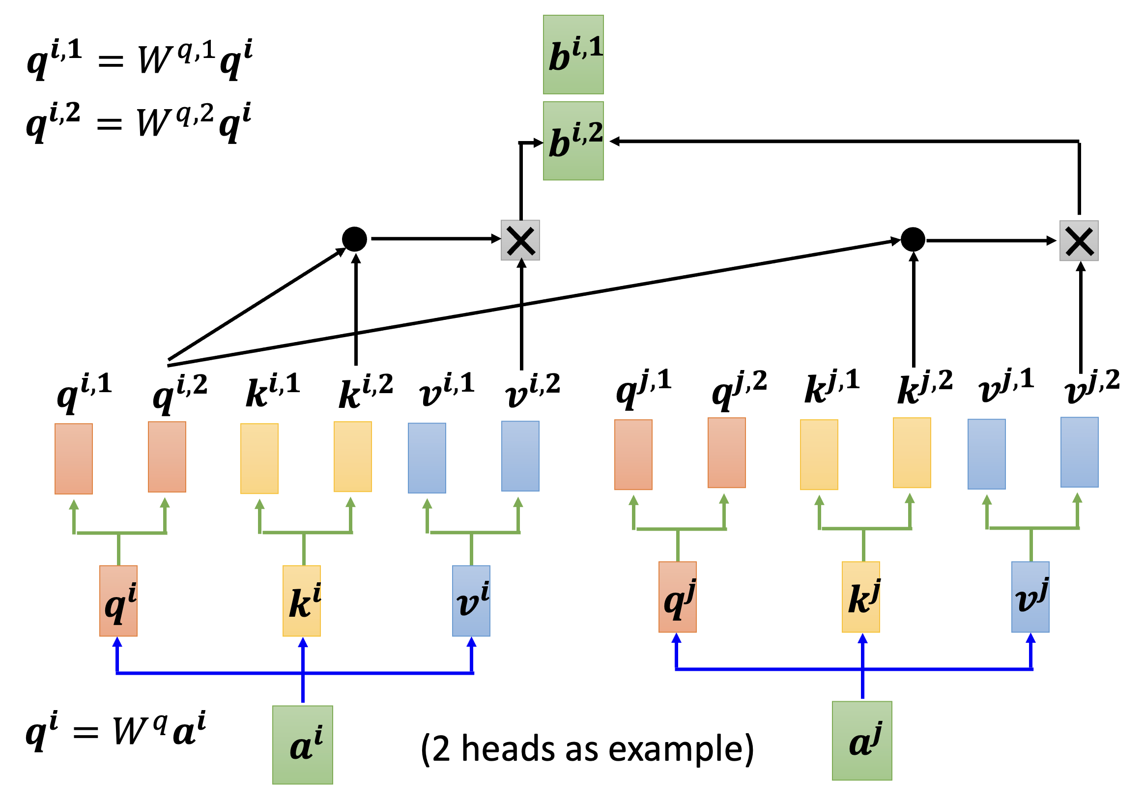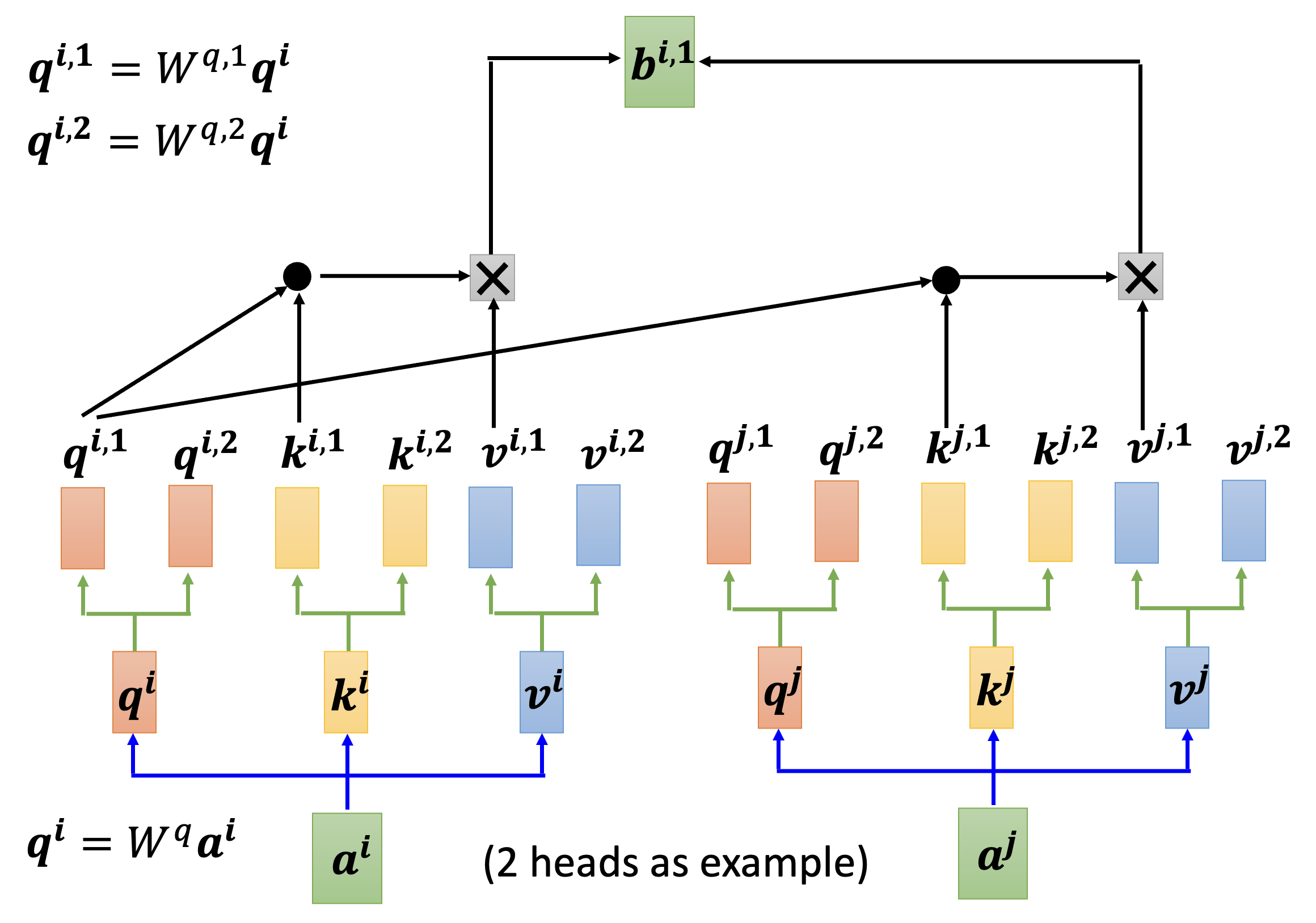 下面以第 \(i\) 个输入 \(\bm{a^i}\) 为例介绍输出 \(\bm{b^i}\) 的计算过程。先算出第一个头对应的输出 \(\bm{b^{i, 1}}\)