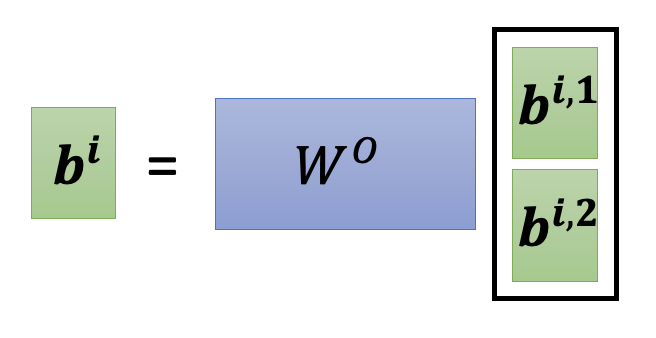 最后将这 2 个向量拼起来,乘上某个矩阵 \(W^O\) 后,就能得到完整的输出 \(\bm{b^i}\) 了: