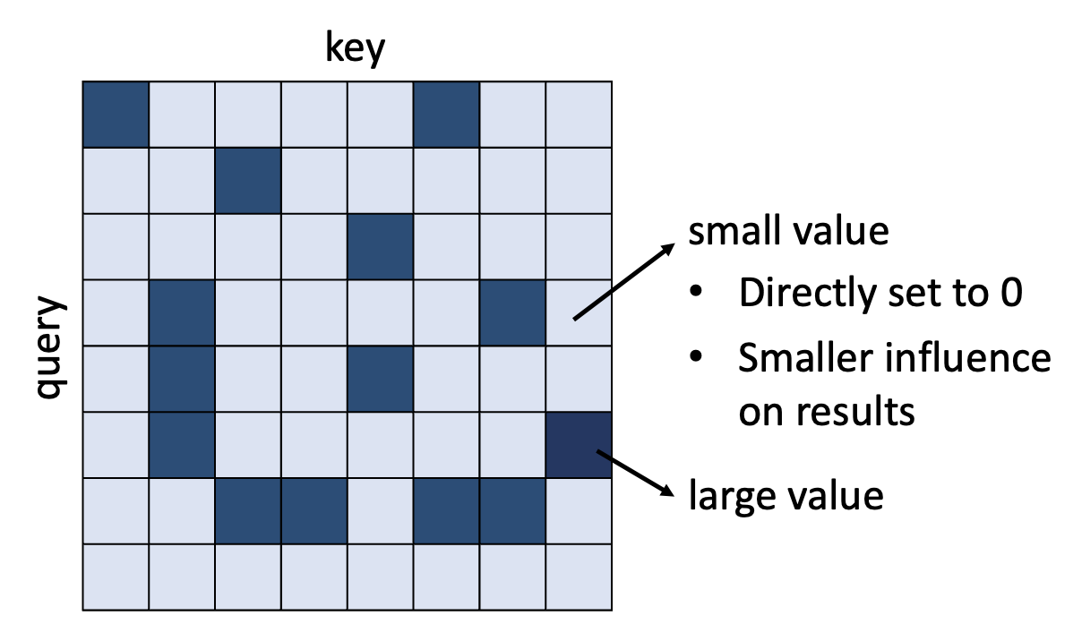 上面通过人类知识简化计算的思路不一定给出最好的结果,所以我们来看另一种思路:对于一个已有的注意矩阵,每个元素的值有大有小。我们决定: