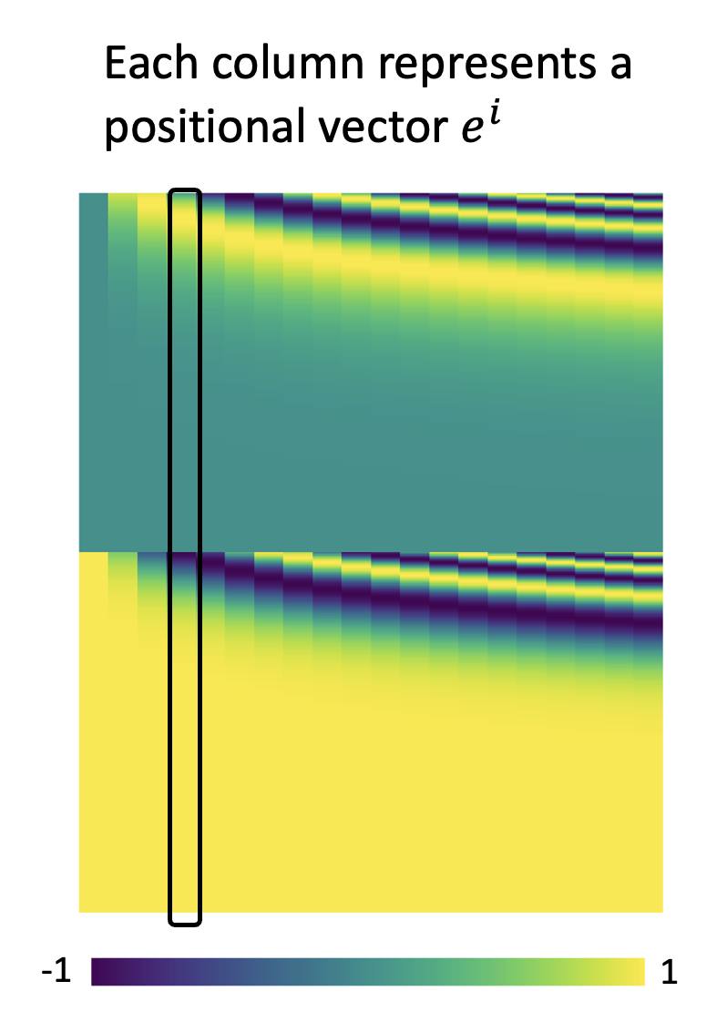 下图展示了一种可行的位置向量序列(这也正是经典论文 Attention Is All Your Need 中最早用到的位置向量,其中 1 列表示 1 个位置向量: