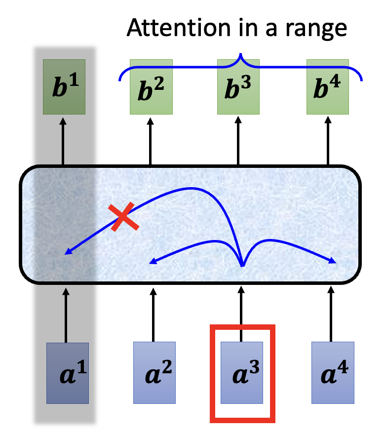 所以我们采取一种改进手段,叫做截断自注意(truncated self-attention)。简单来说就是:对于某个输入向量,我们仅考虑那些和当前输入向量比较接近的向量作为键,不去考虑更远的向量。在语音识别中,这种做法是合理的,因为要识别一句话中的一个字,我们往往无需得知整个段落的内容,也许仅靠这一句话甚至半句话就能判断出来了。