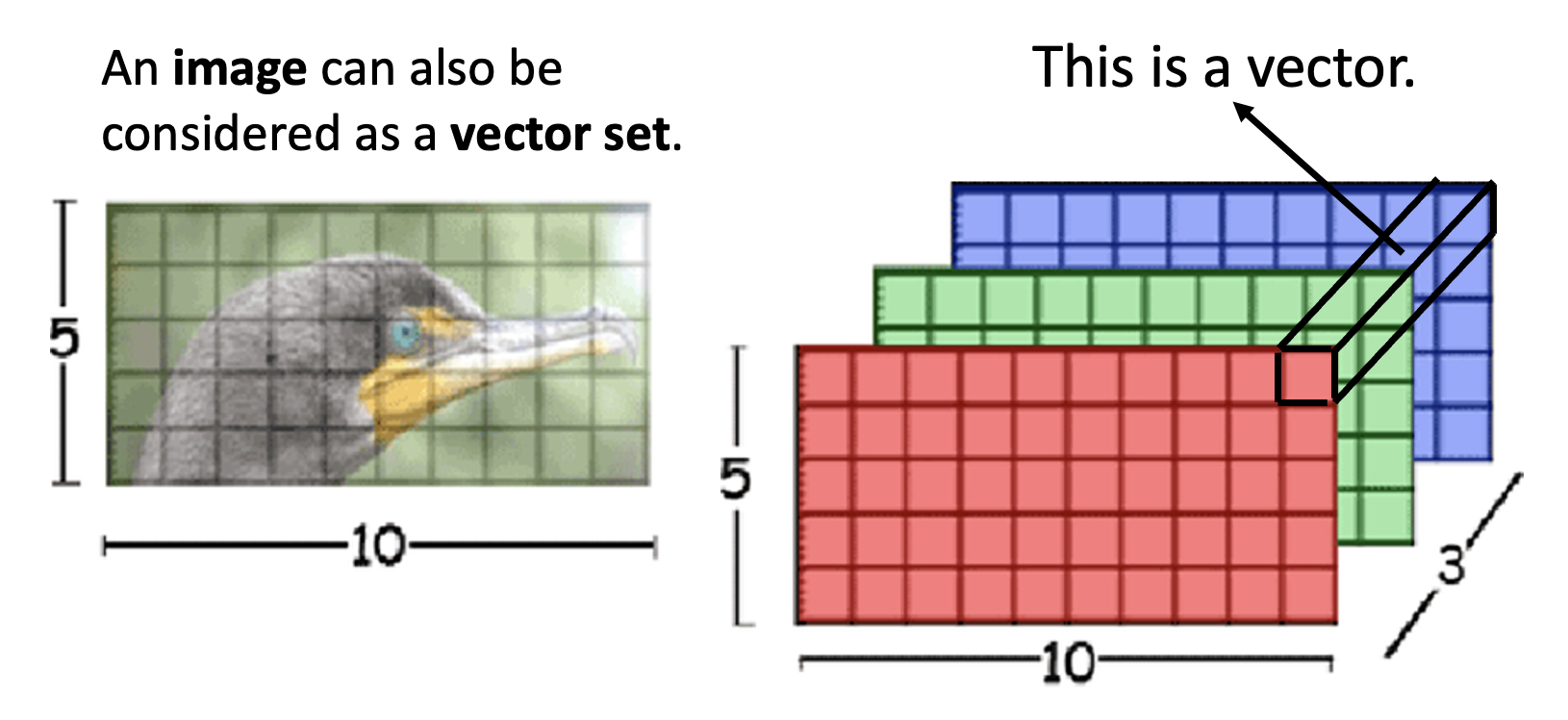 图像除了能用 CNN 来训练外,也可以用自注意来训练。我们可以将一张图像看作是一个向量集,而每个像素点就是一个向量,每个通道就是向量的元素。