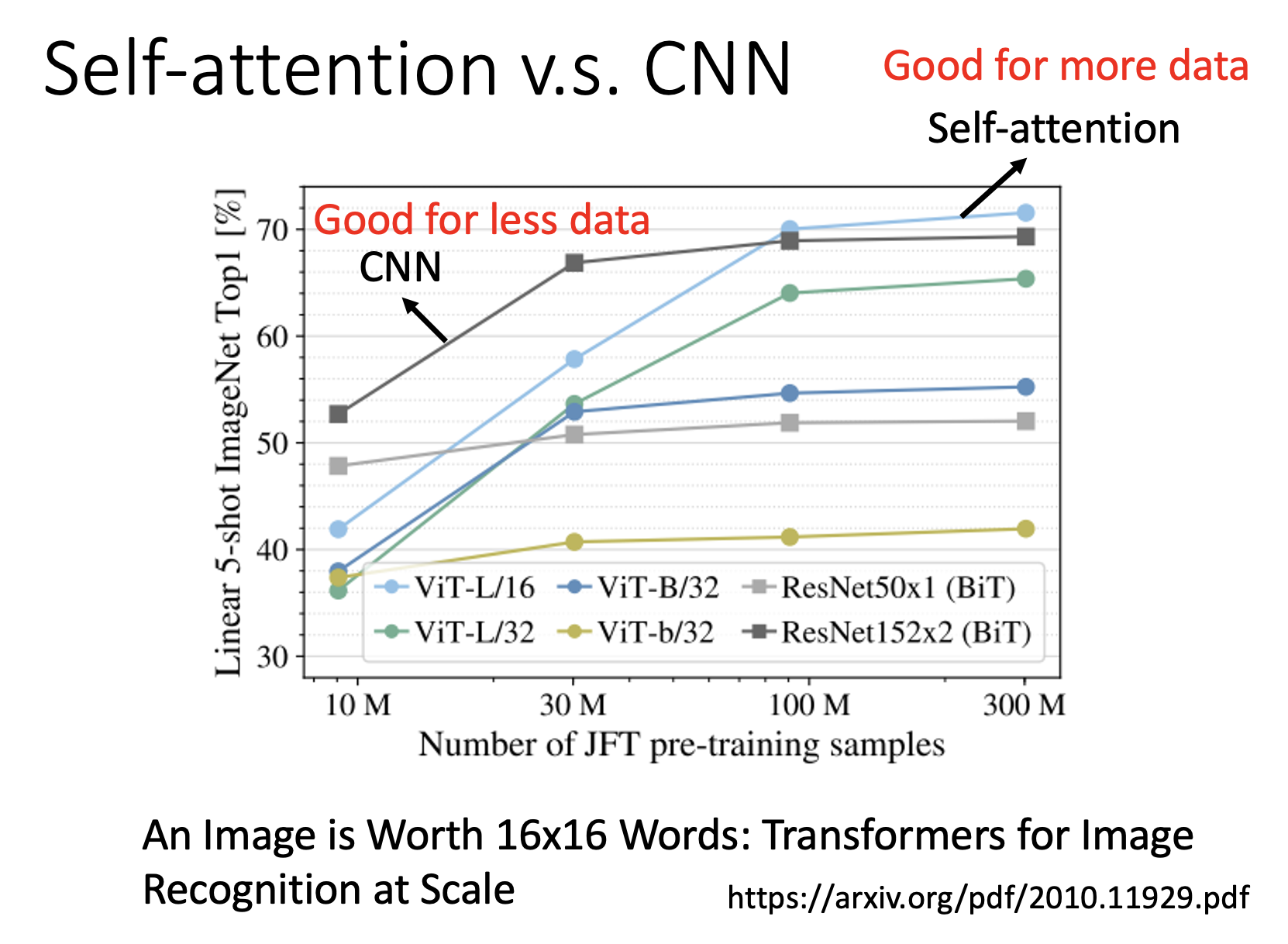 由于自注意机制会考虑更多的输入,因而更加灵活,所以在数据不多的情况下更容易出现过拟合现象,效果就不如 CNN 了;而一旦数据量大到一定程度后,自注意机制的优势就显现出来了。