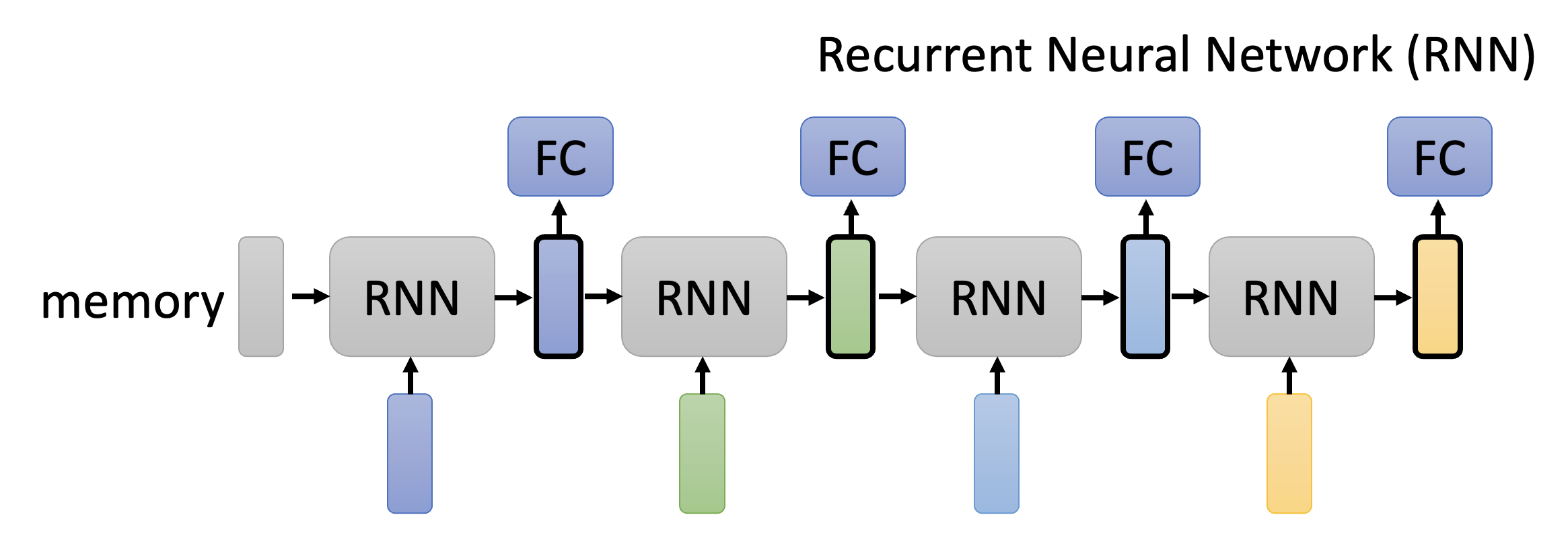 • 这个输出将和第二个输入向量一同放到 RNN 中,得到下一个输出,该输出也会进入 FC(全连接层)的训练中。之后就以此类推下去,故不再赘述。