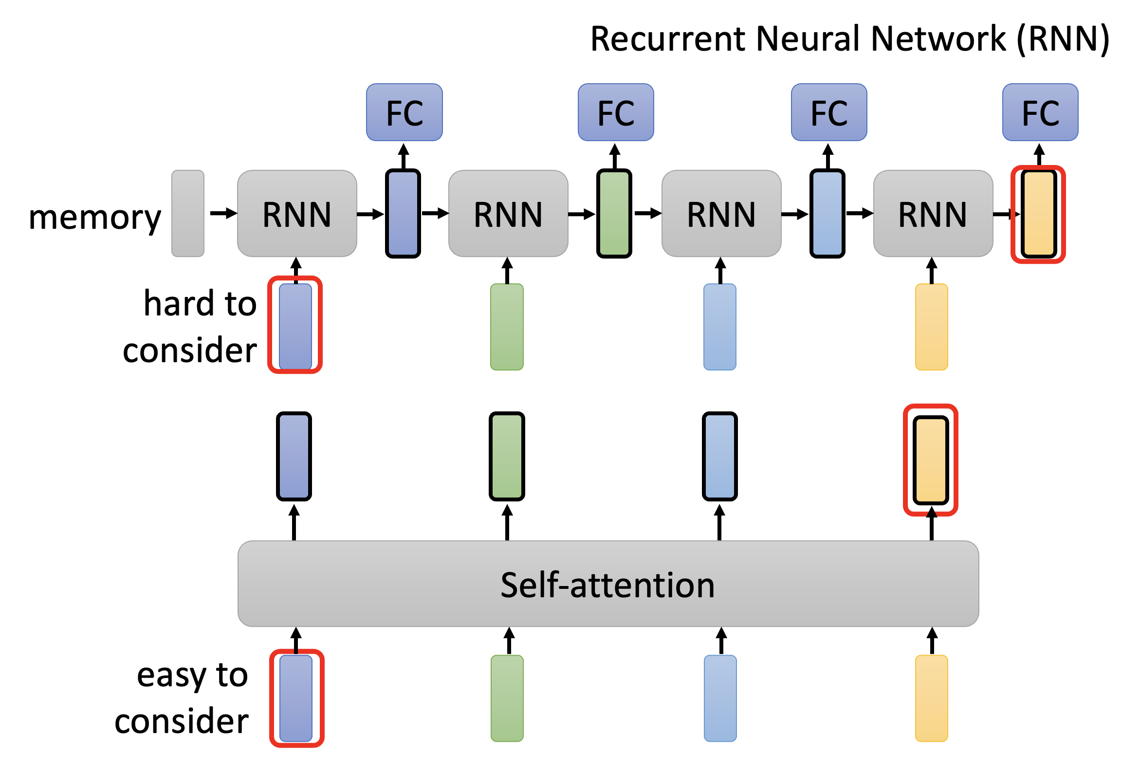 • 难以考虑太远的输入向量:虽然我们可以将 RNN 改为双向的(这样的话输出向量都能包含任意输入向量,而不是像图示那样只能考虑左侧的输入向量,但相比自注意机制能一次看透所有输入的能力,读取较远位置的输入向量还是有些差劲的。