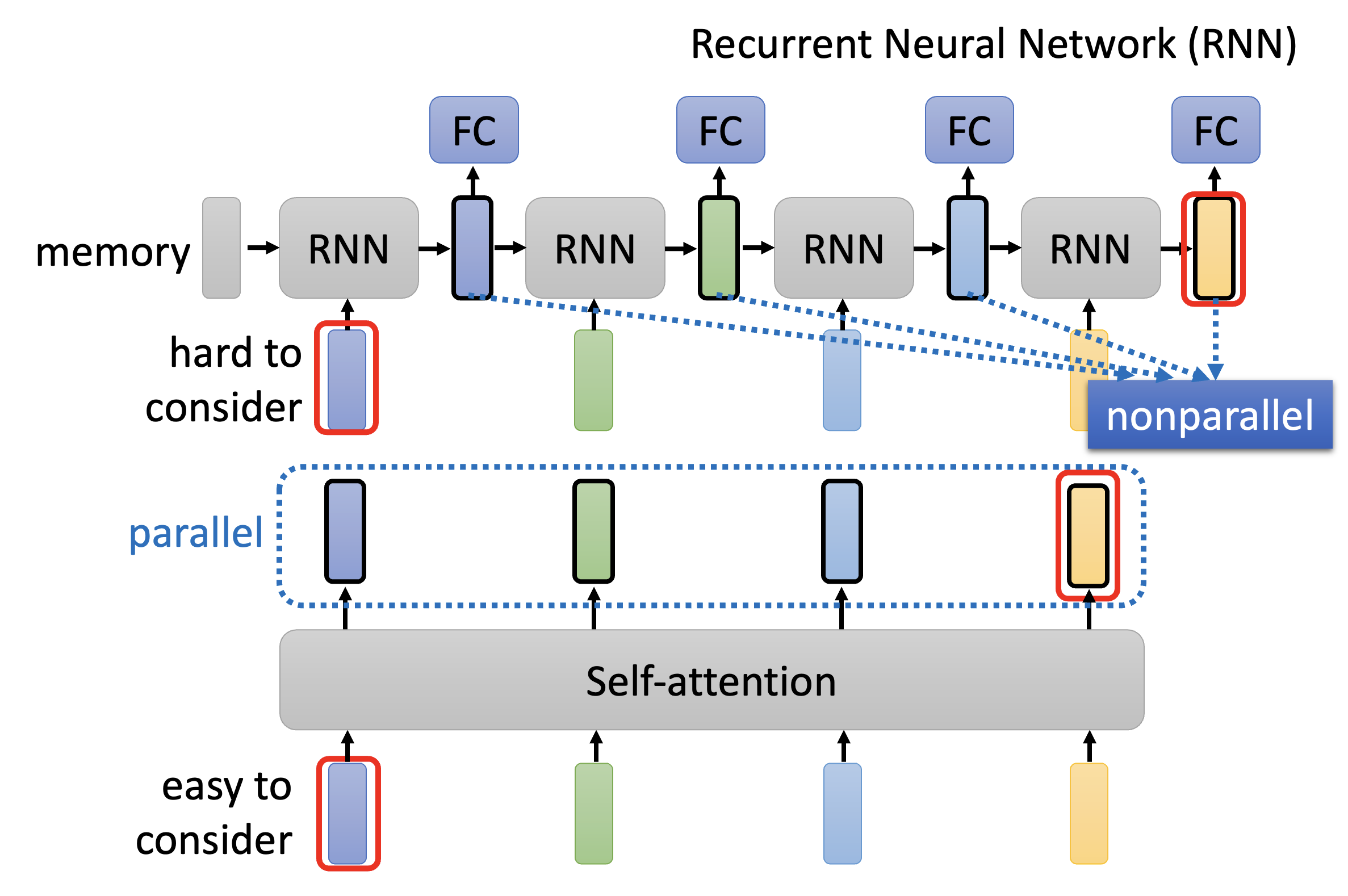 • 无法并行:其实解释和前面的差不多,就是 RNN 需要一个个看输入,不能并行加速;而自注意能通过并行一次看完所有输入,所以效率之间有着很大差别。
