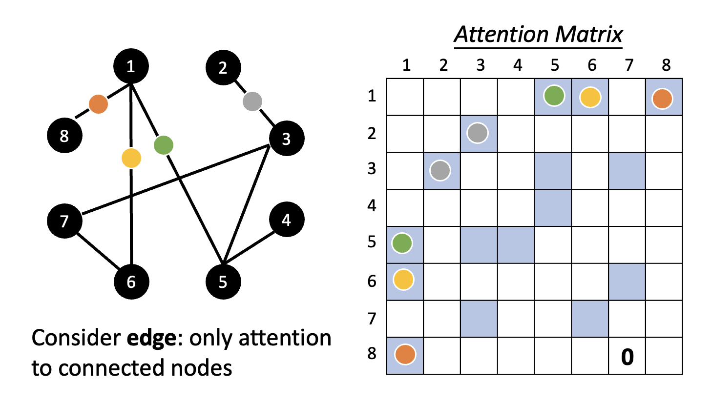 这里利用了图的信息,尤其是边的信息。我们仅考虑有边相连的两个节点对应的注意矩阵上的元素(蓝色方框,其他元素均为 0(白色方框,这样我们就不会训练哪些没有意义的参数了。