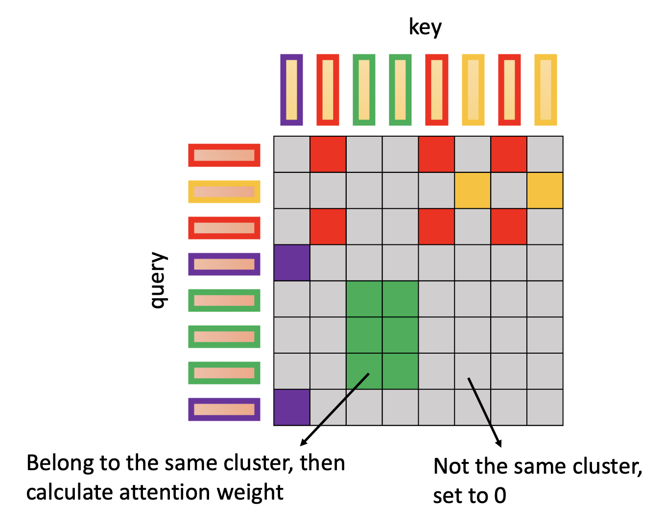2. 在注意矩阵中,我们只计算那些位于同一集群中的查询和键的乘积,不同集群的就不去计算,直接置 0 就好了