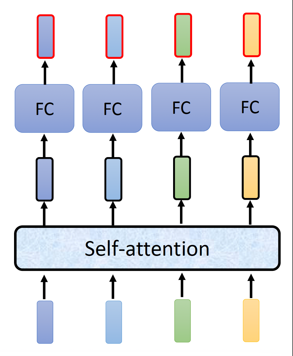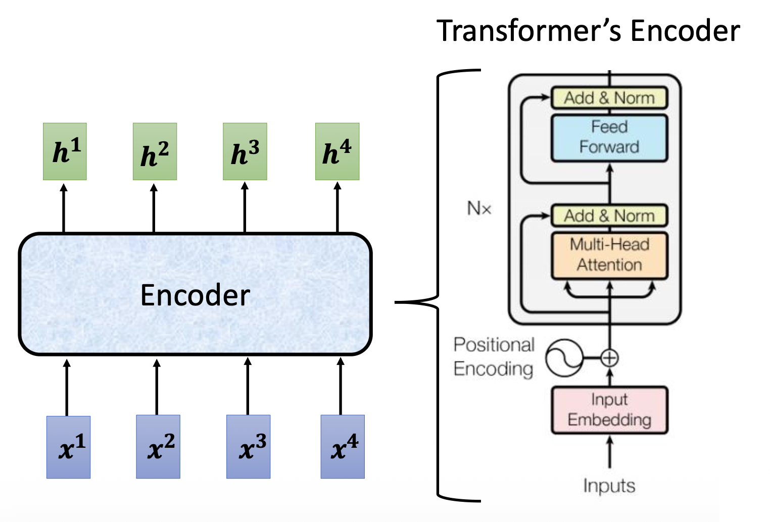 简单来说,编码器要做的事就是对于给定的一组(输入)向量,输出一组向量。也许读者会想:之前介绍的 RNN 或 CNN 也能完成这样的任务,那么这个编码器的高明之处在哪里呢?那我们就得关注编码器的具体实现了(右图)~