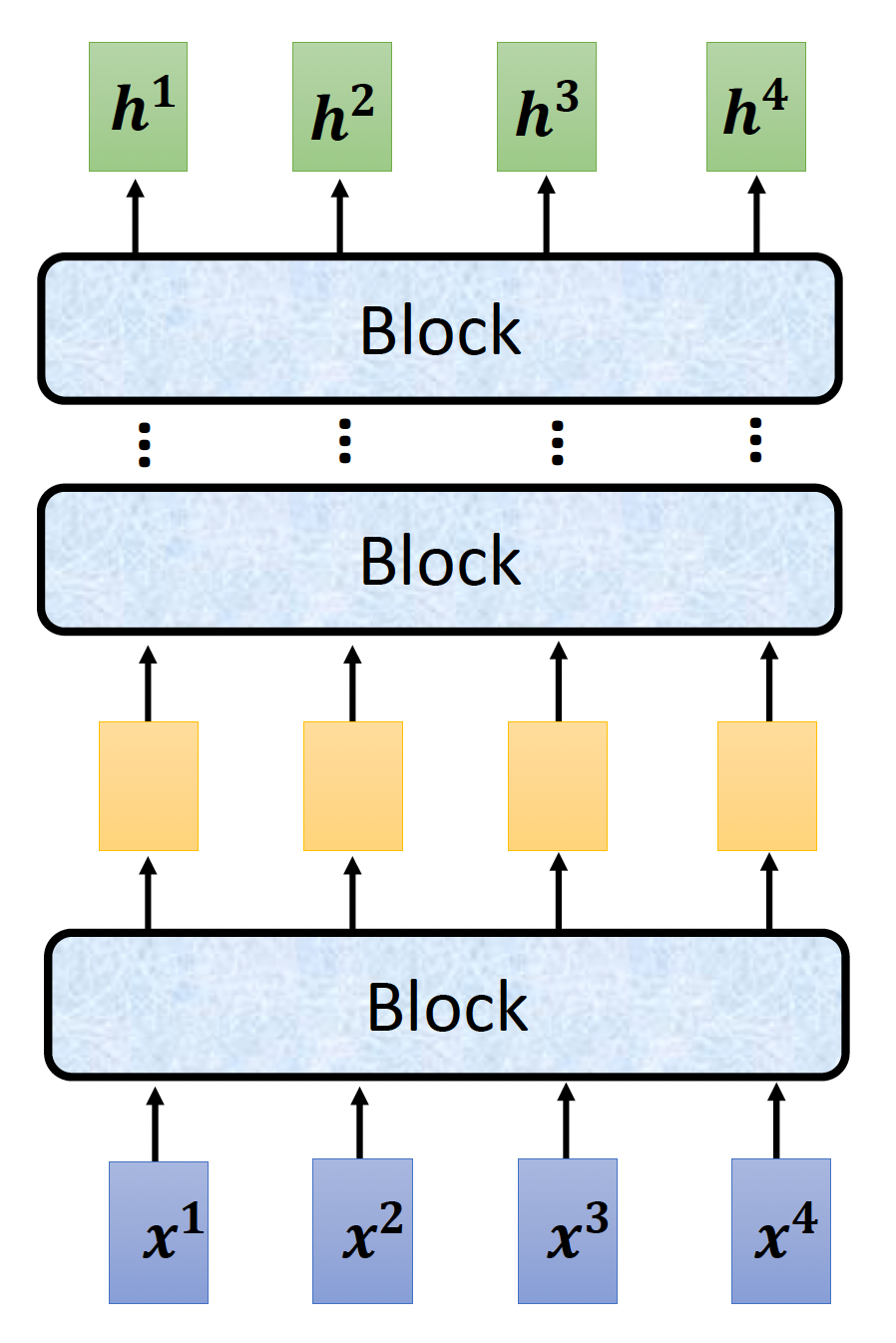 可以看到,编码器内部被划分成多个块 (block),每个块要做的就是接收一组向量,然后输出新的一组向量,传递给下一个块。而每个块内部的实现如下——实际上用的就是前面刚介绍的自注意机制 + 全连接神经网络