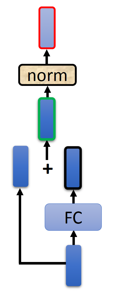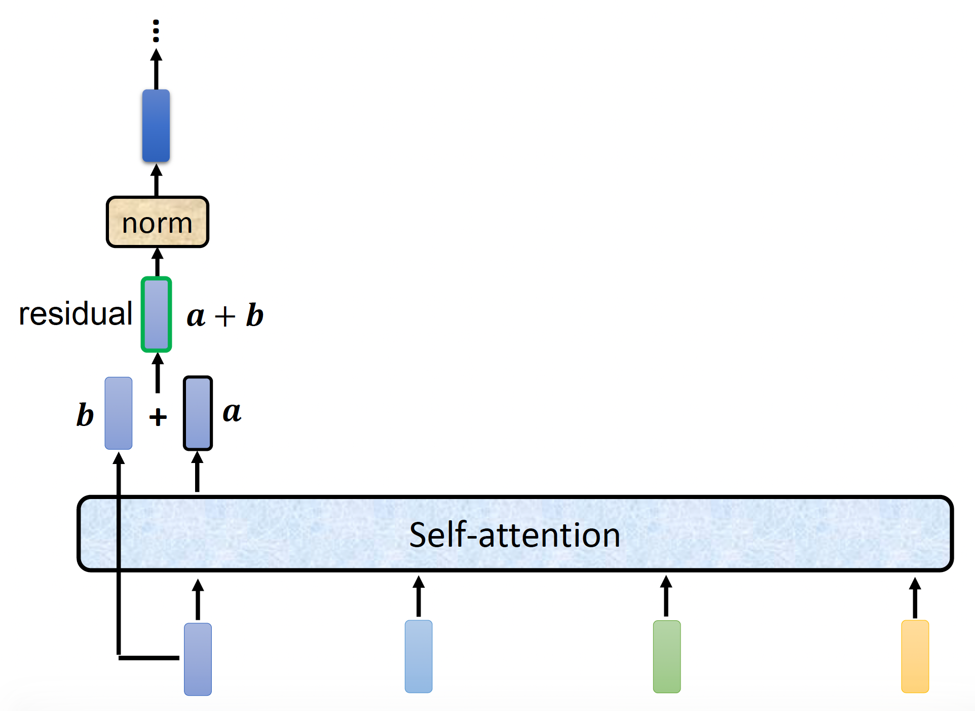 - 先做一次残差连接(residual connection):\(\bm{a} + \bm{b}\)