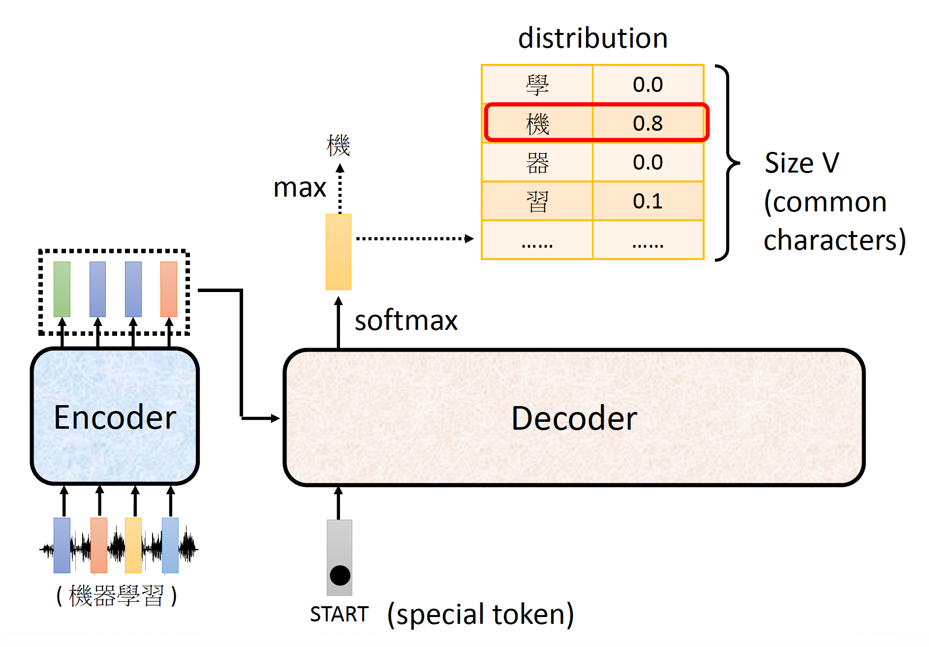 ) ,使得向量所有元素之和 = 1,此时输出向量就是一个概率分布(distribution) - 向量元素值最大的对应的字就是最终的输出