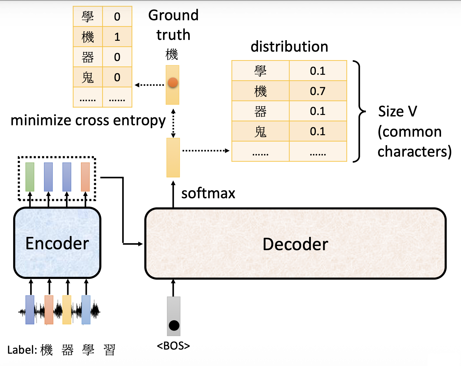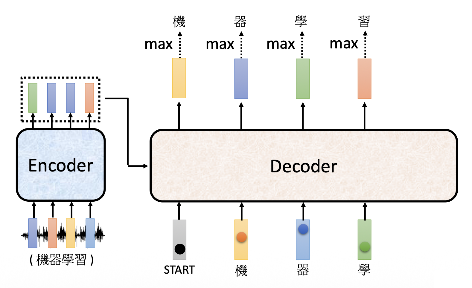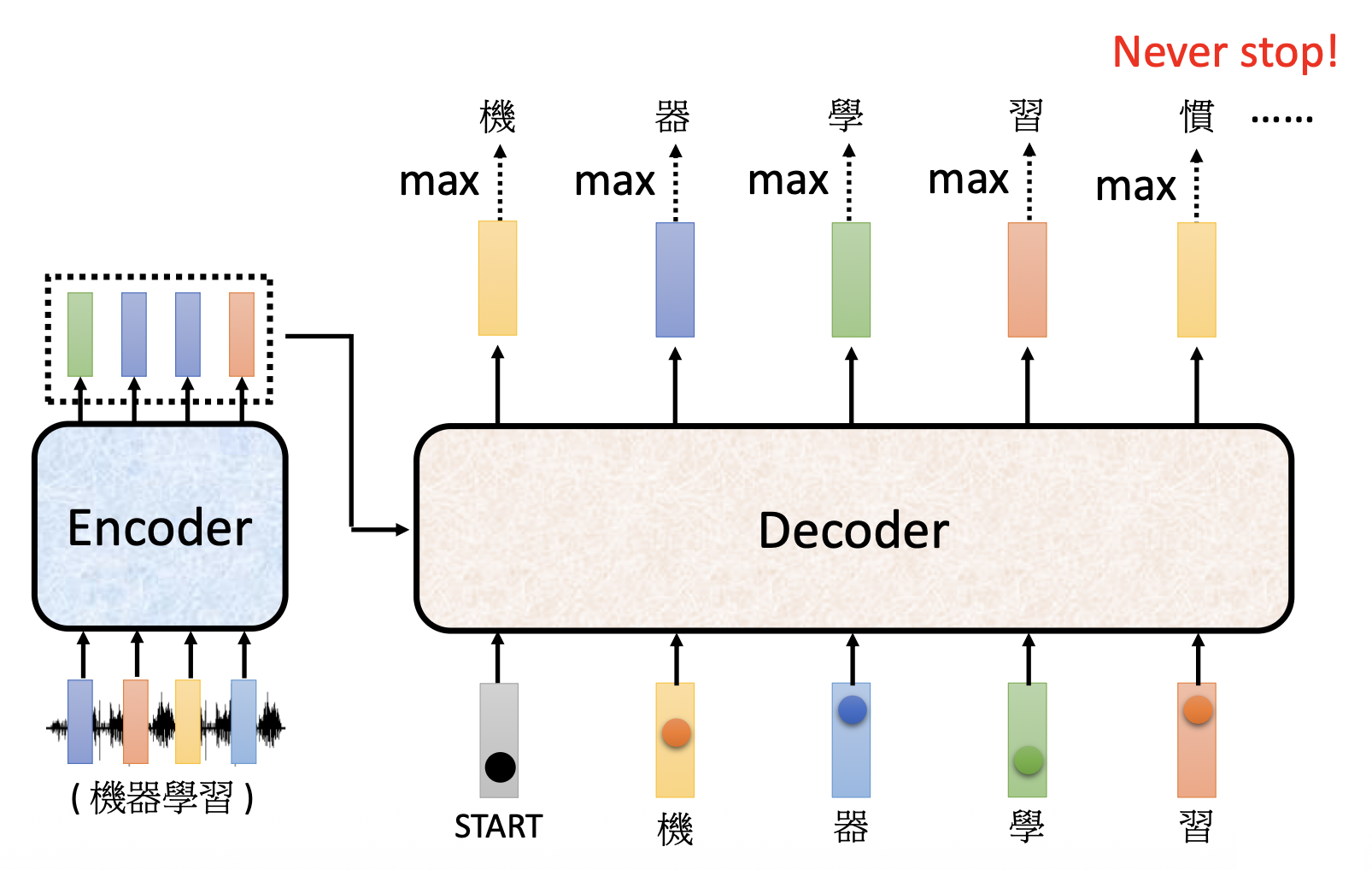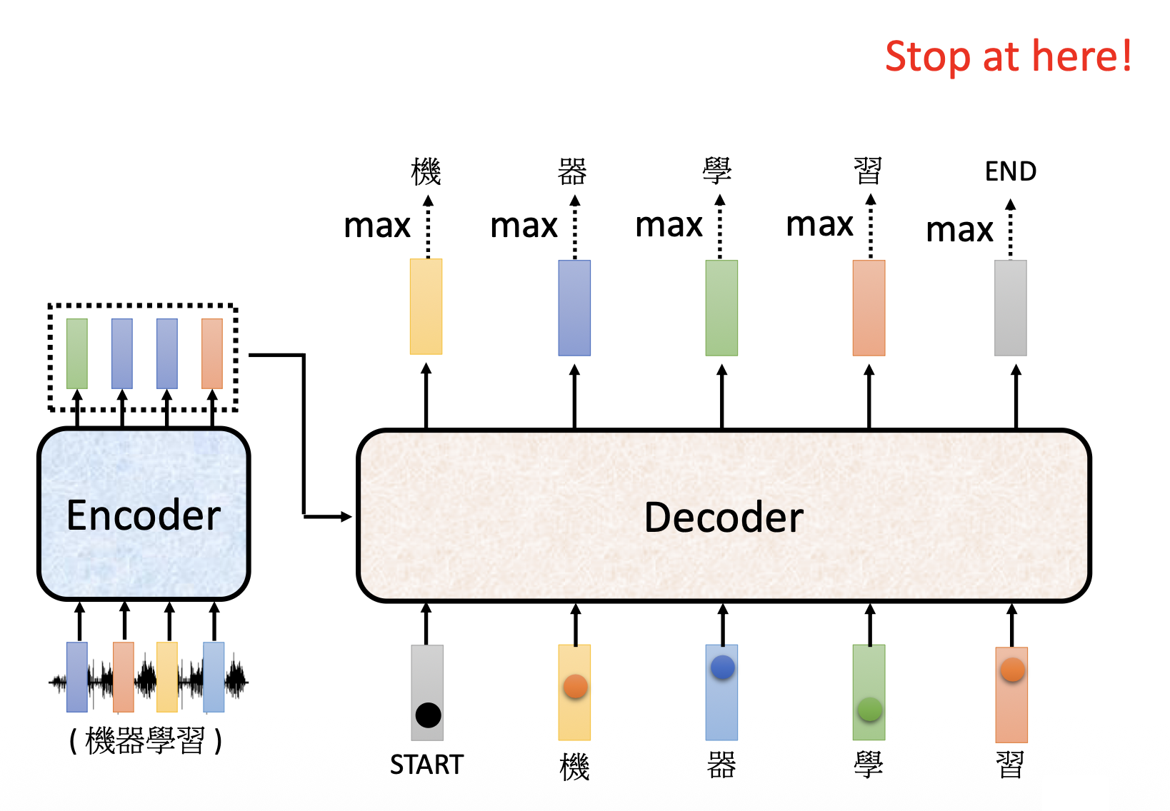 和解码器最初接收的 START 特殊记号一样,我们引入一种停止记号,记作 END。对于前面“机器学习”这四个字的语音识别,我们要求解码器在看到 BEGIN 记号和这四个字对应的输入向量后,就知道语音识别要结束了,应该输出 END 记号,从而结束输出。