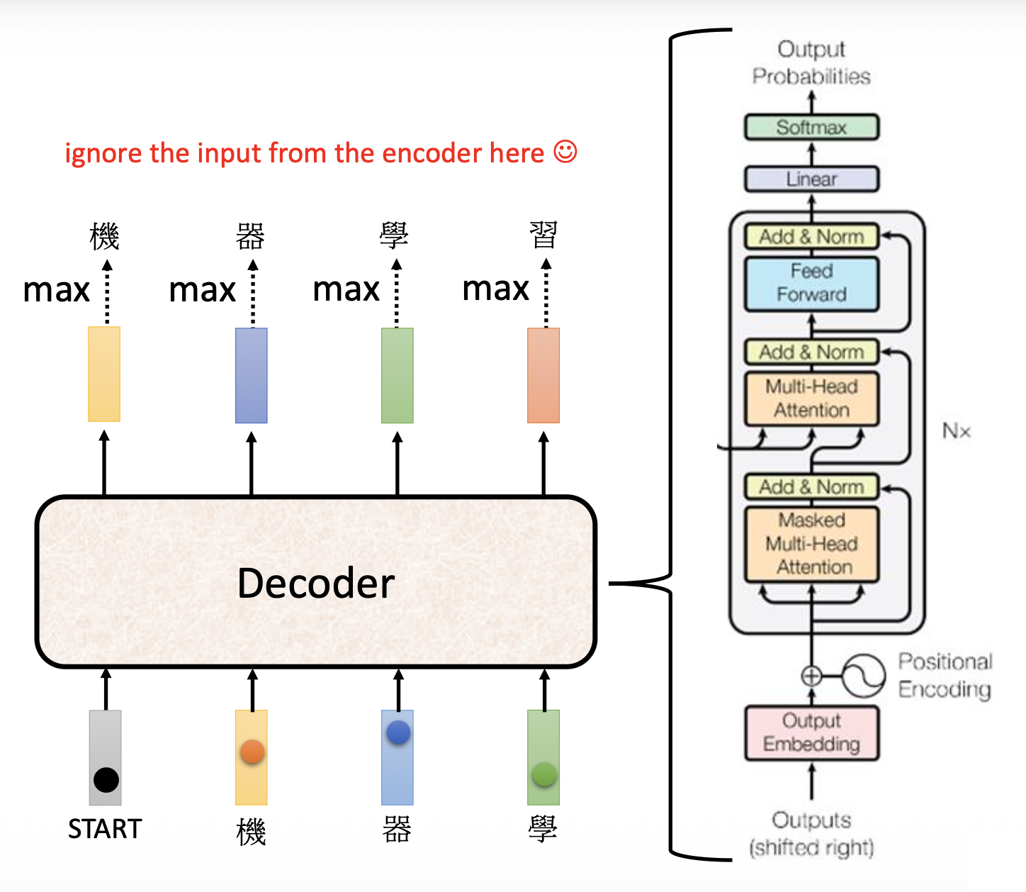 - 在解码器生成向量前要经过 softmax 处理(类似做分类任务
