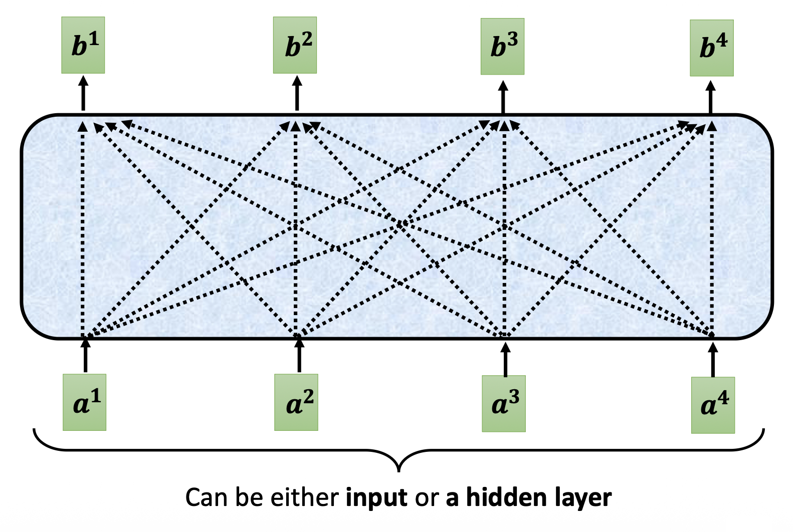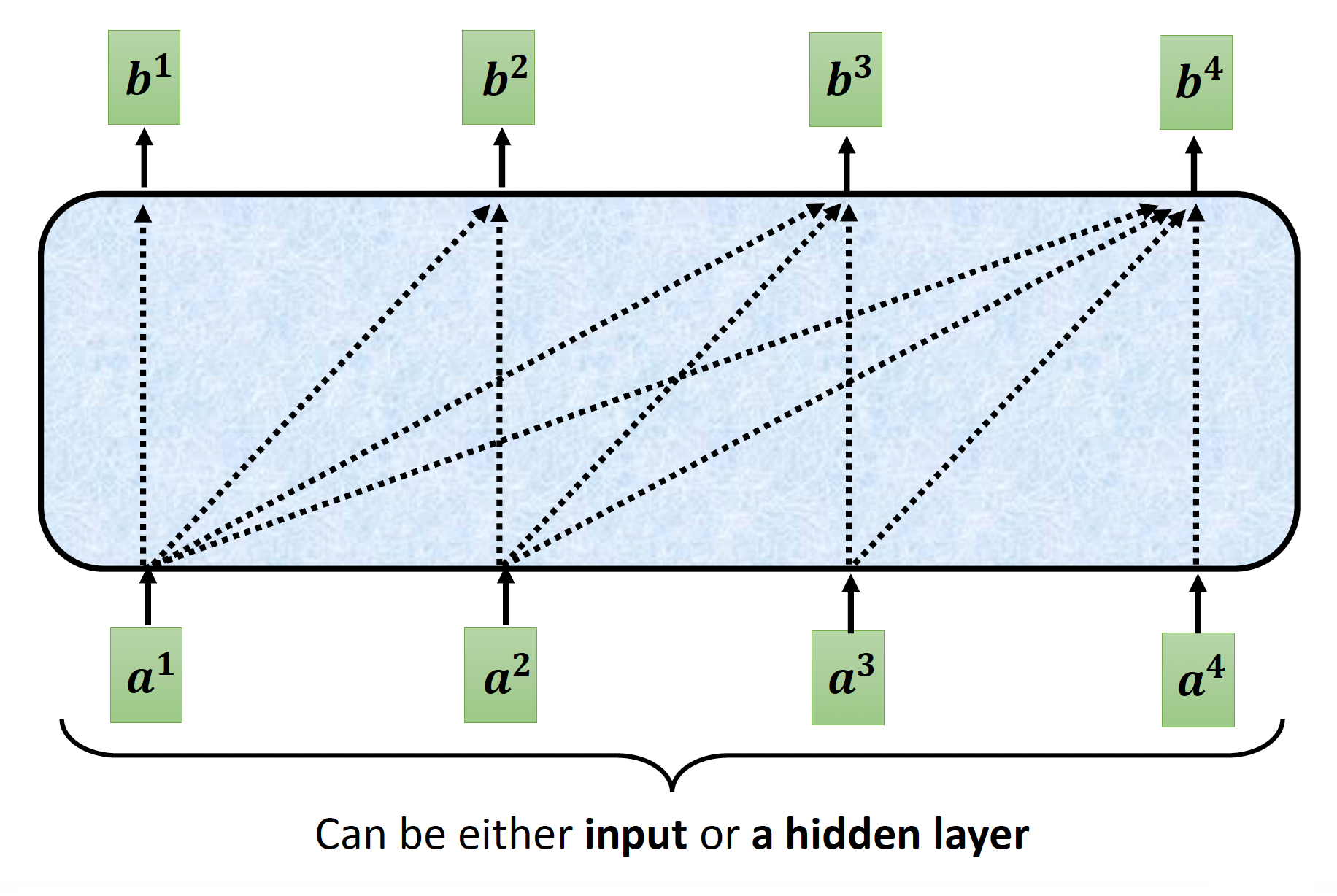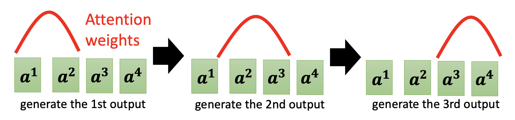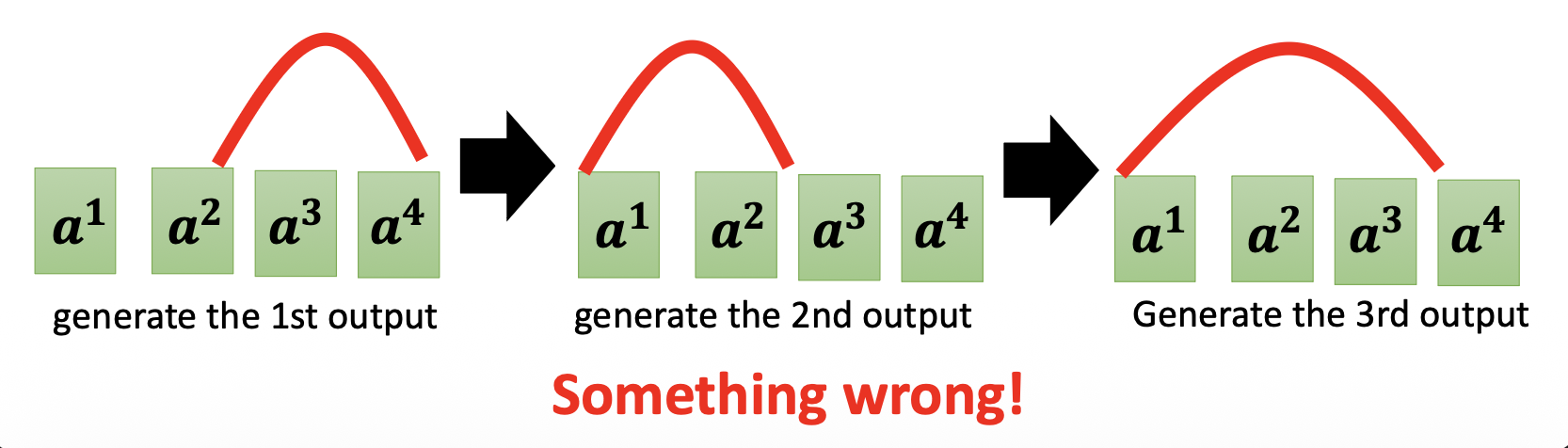 不难发现,在掩码版本的自注意机制中,输出向量 \(\bm{b}^i\) 只能读取其左边的输入向量(从 \(\bm{a}^1\) 到 \(\bm{a}^{i}\)