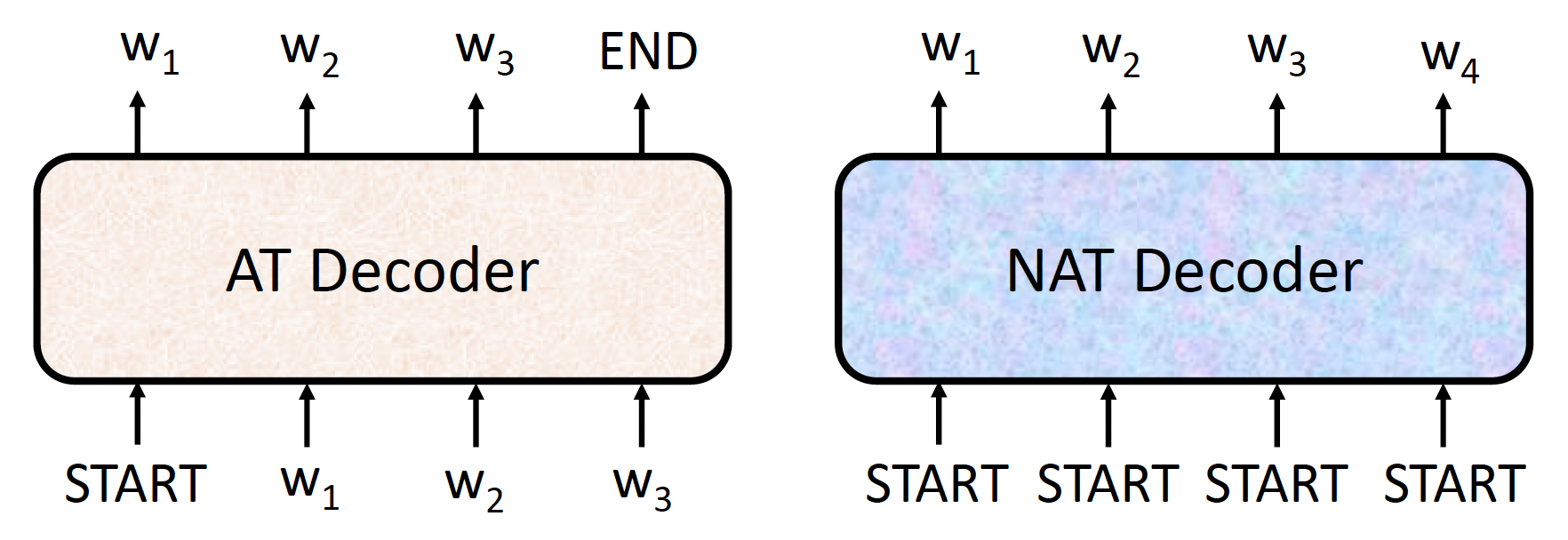 对比自回归 (AT) 和非自回归 (non-autoregressive, NAT) 这两类解码器: