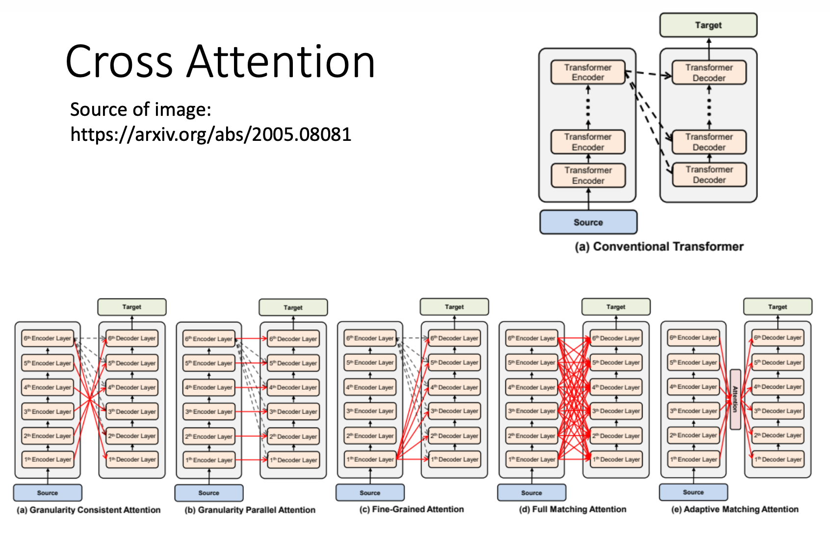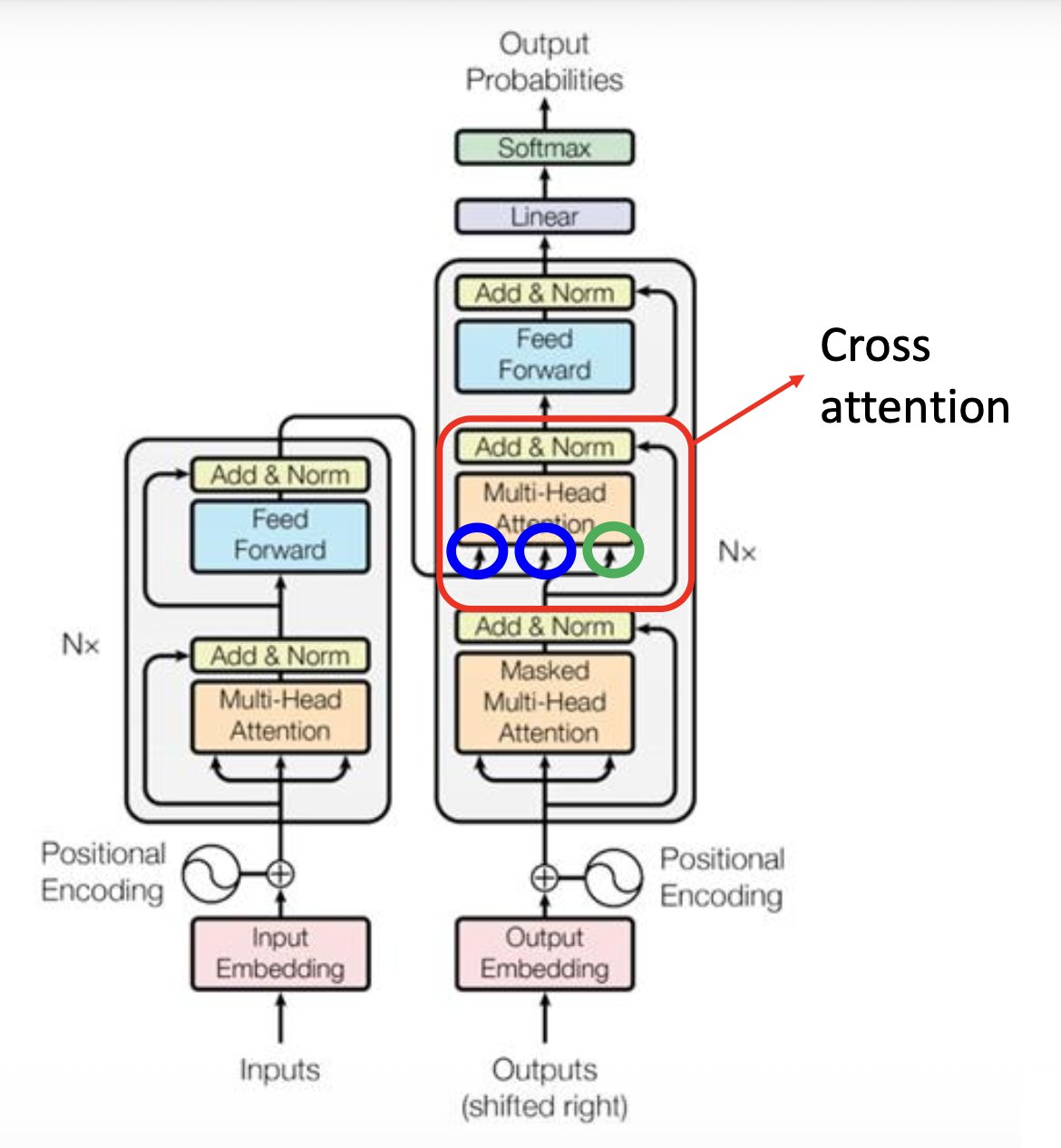 接下来考虑前面被我们忽略掉的一个问题:编码器和解码器之间是如何传递数据的?这个结构就藏在前面被遮挡的解码器模块——交叉注意(cross attention) 中: