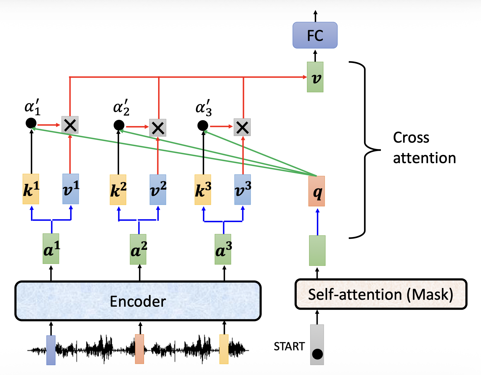 但为什么要这么做呢?答案就在解码器的工作机制中——前面提到过,解码器第 \(i\) 个位置上的输出向量是根据之前的输出向量(左侧)得到的,所以它只知道前面的向量是什么,无法得知所有的输入向量。这就是为什么解码器的自注意比较特殊的原因。