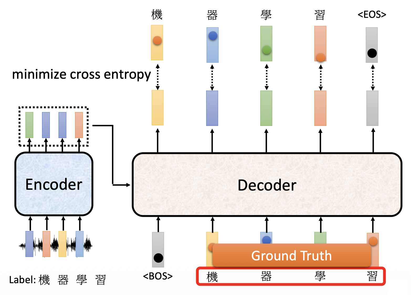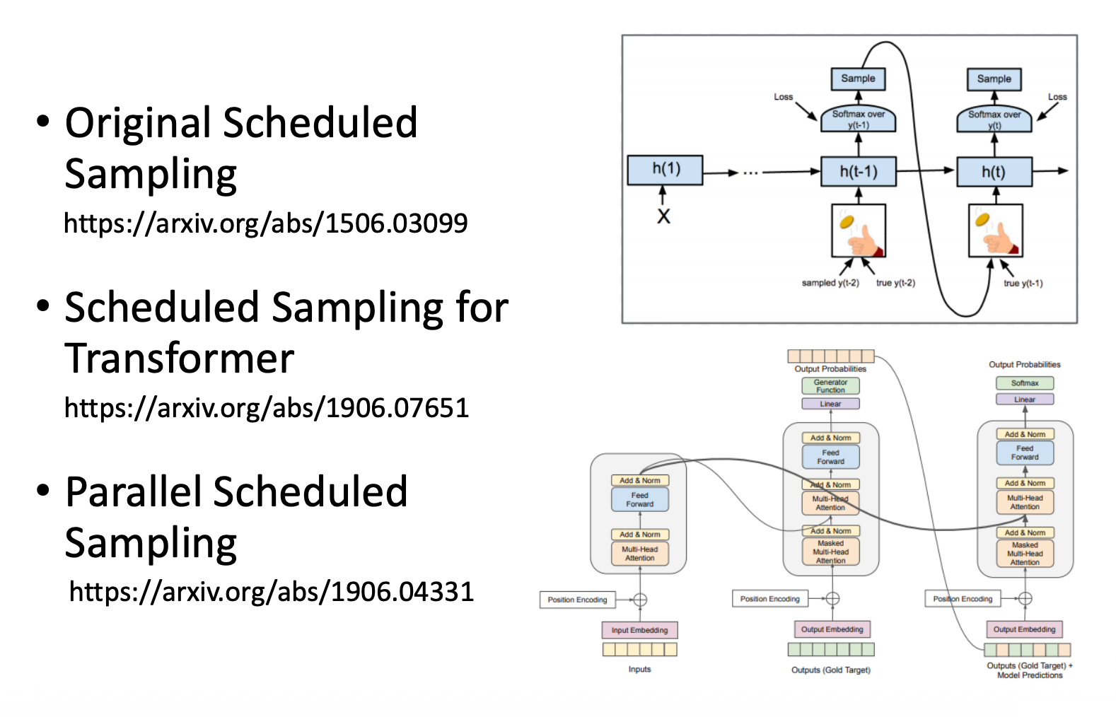 一种解决思路是:在训练的时候不要完全用基准事实,可以偶尔给一些错误的输入,这样反而模型会学的更好。这种技术称为调度采样(scheduled sampling)。