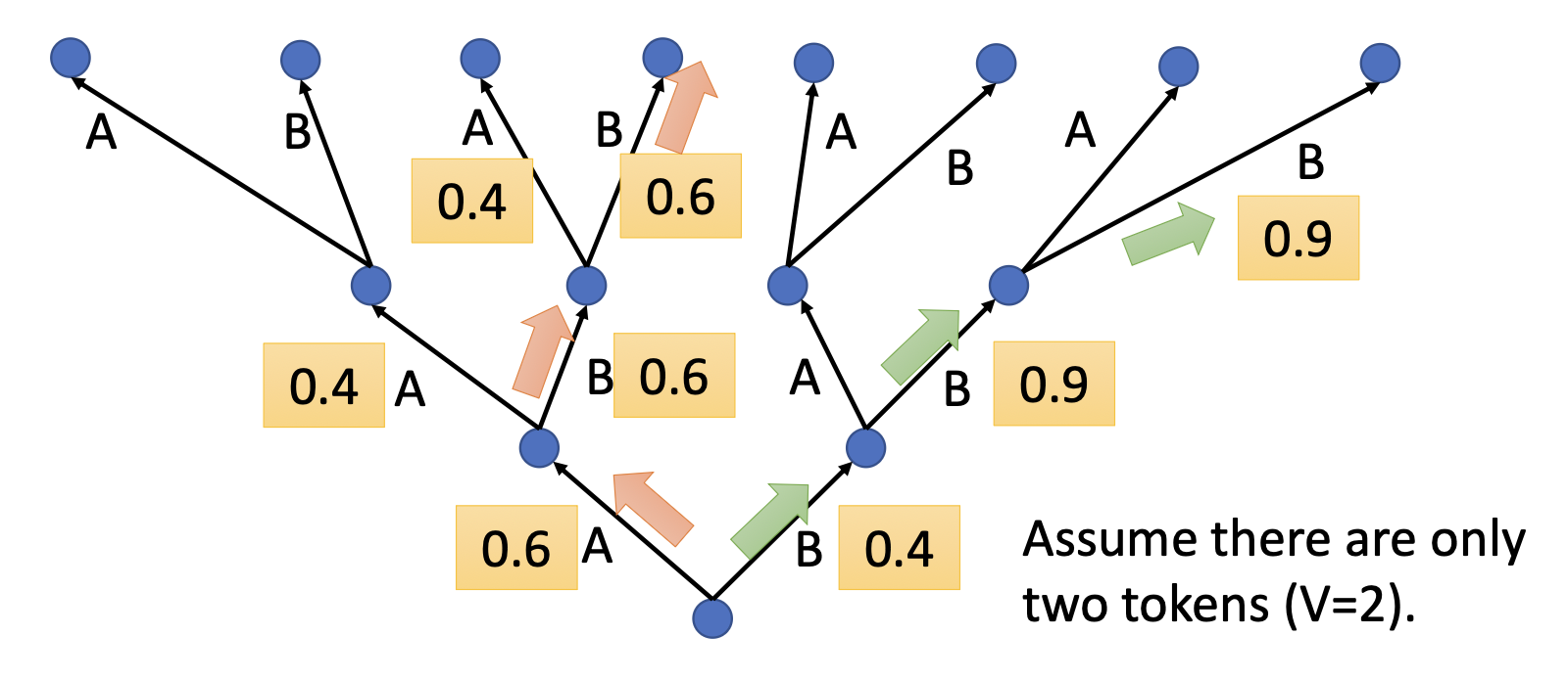 要想找到最好的路径,最简单的做法是暴力搜索,把所有可能的路径遍历一遍。但路径树是可能输出数的指数,所以可能的输出数很多的时候,路径数就会变得特别大,显然是无法全部遍历一遍的。这时就要采用一种称为束搜索(beam search) 的近似算法,寻找近似解。一件有趣的事是,该算法有时得到不错的结果,有时结果会很烂。