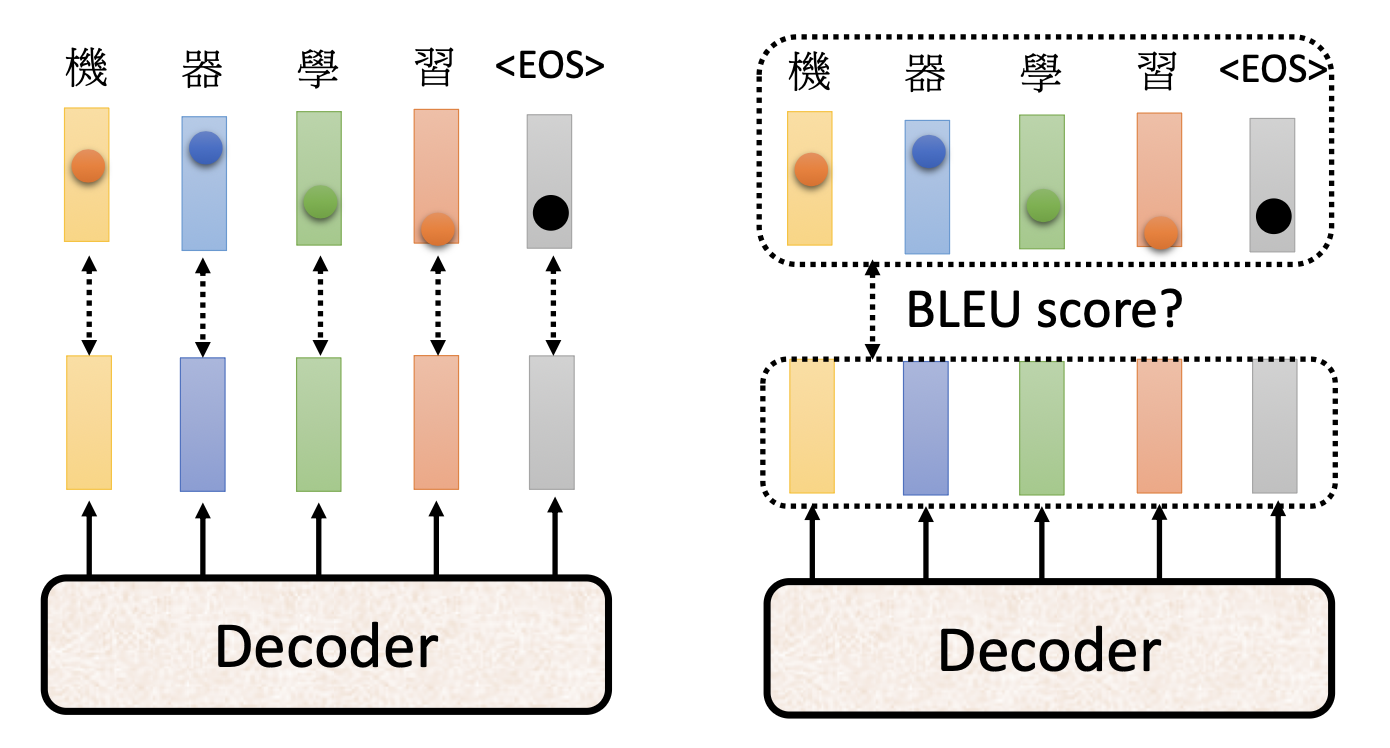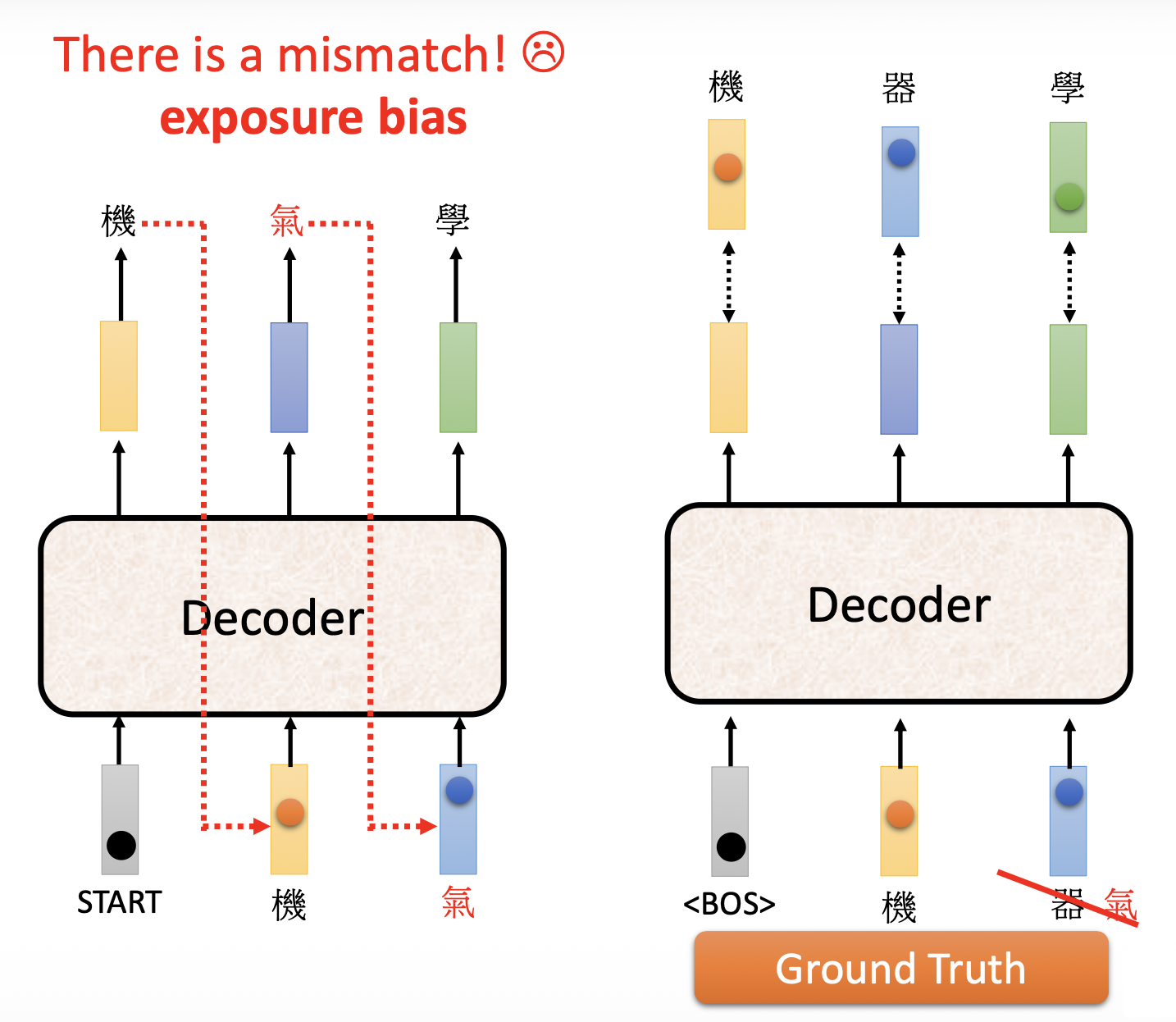 前面还放跑了一个问题:测试(左图)和训练(右图)结果的不匹配,这种现象称为暴露偏移(exposure bias)。由于测试的时候解码器读取的是之前的输出,假如之前的输出是错的,那么解码器就会根据这个错误的输入来接着输出,这样很有可能导致“一步错,步步错”的情况。