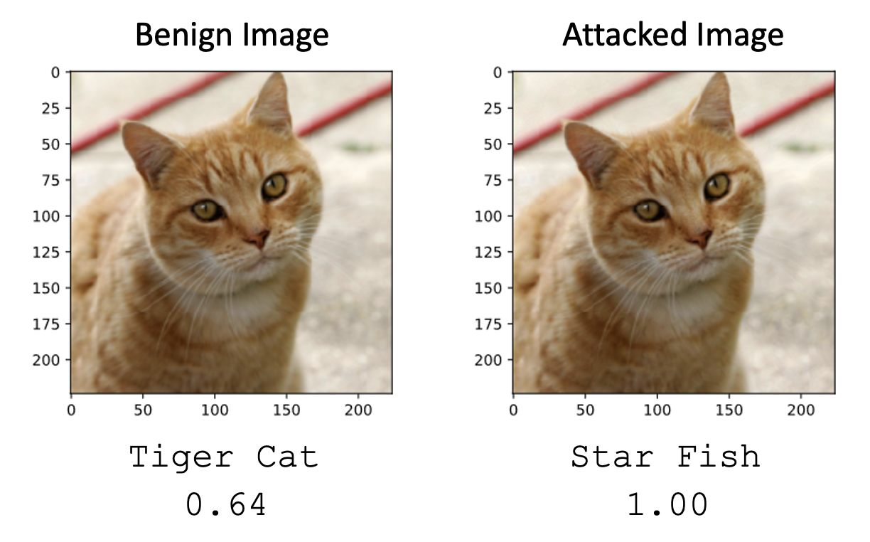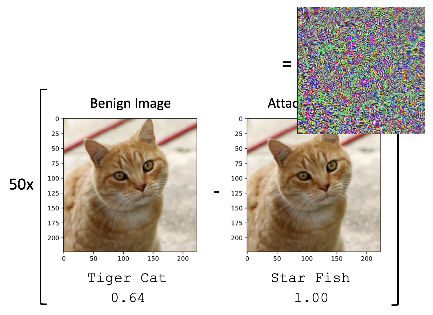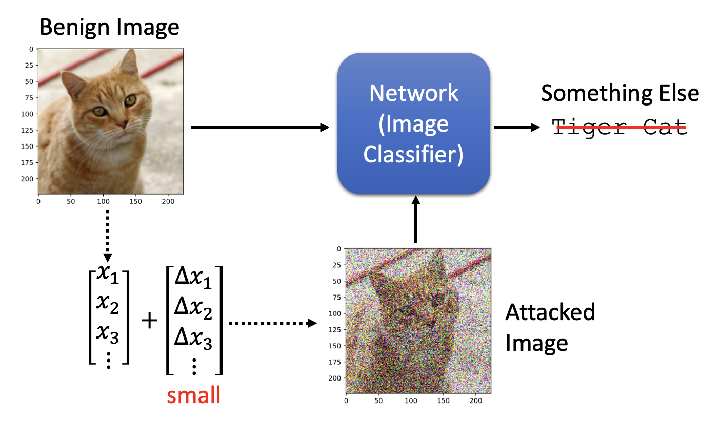 攻击的一般思路是向原输入数据加入人眼无法察觉的“噪音”,使得模型对加入噪音后的数据产生与原数据完全不同的输出结果。下面主要以图像作为数据形式来介绍。我们称原图像为良性图像(benign image),而加入噪音后的图像为攻击图像(attacked image)。