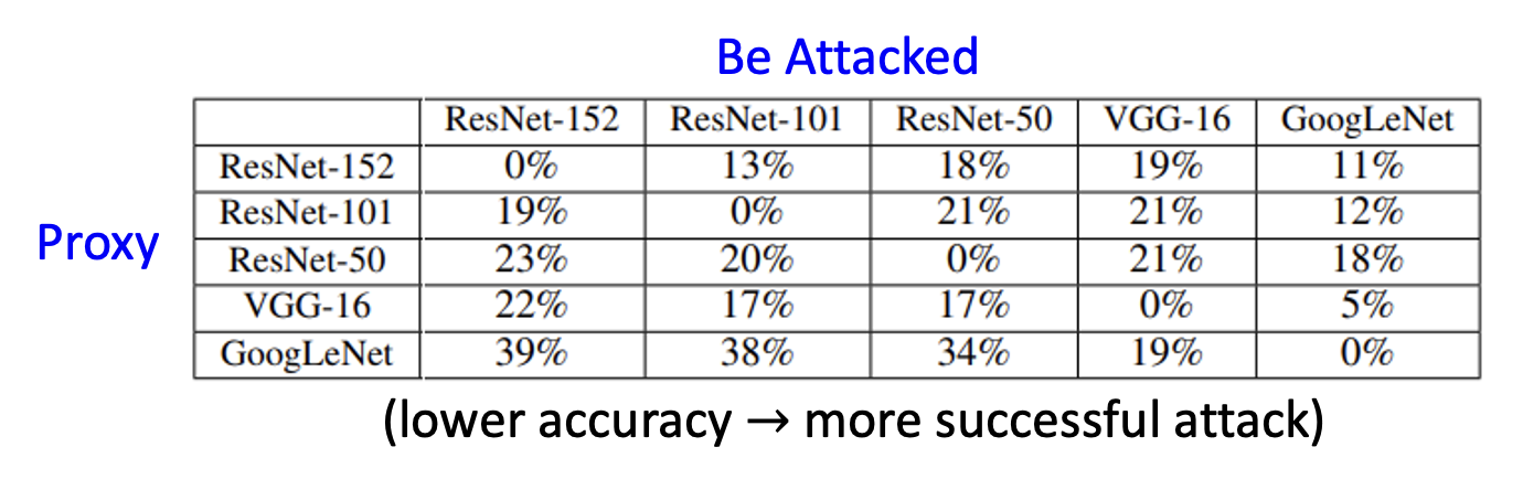 前面都是在已知网络参数 \(\theta\) 的情况下讨论攻击的,我们称这样的攻击为白箱攻击(white box attack)。而对于大多数的在线的 API,我们无法得知模型的参数,但这并不意味着这个模型就是安全的——因为模型有可能遭受黑箱攻击(black box attack)。
