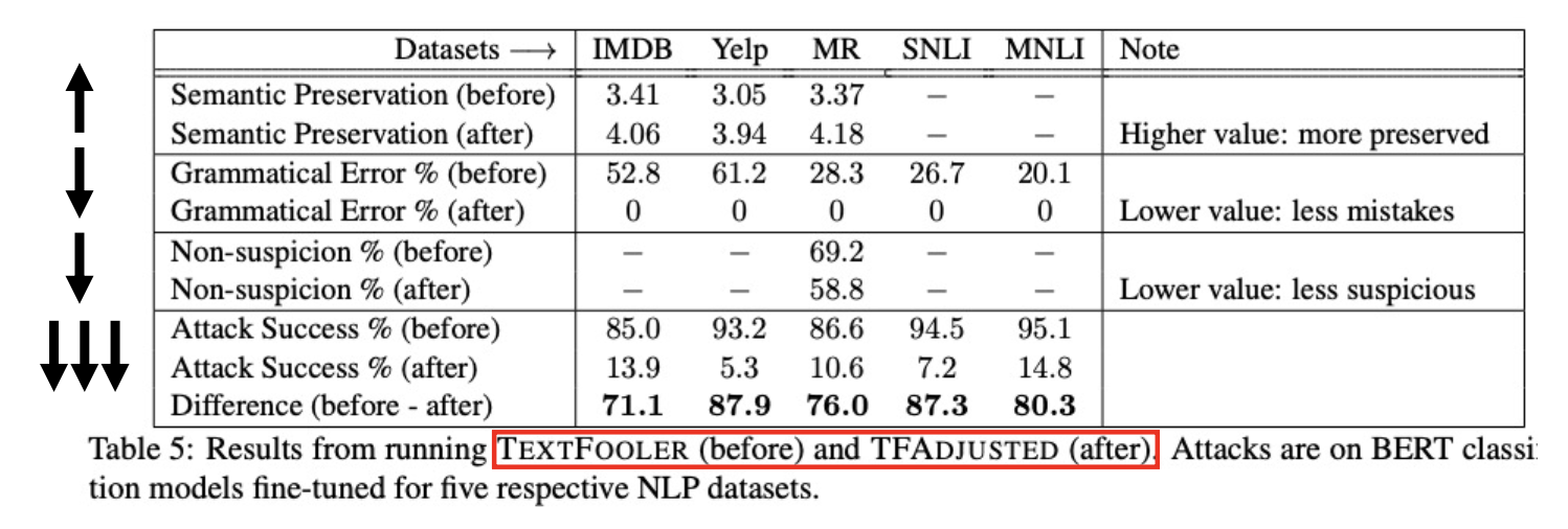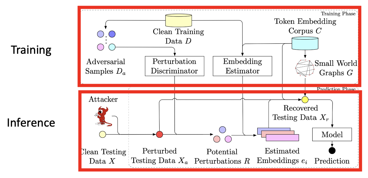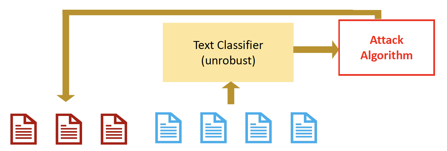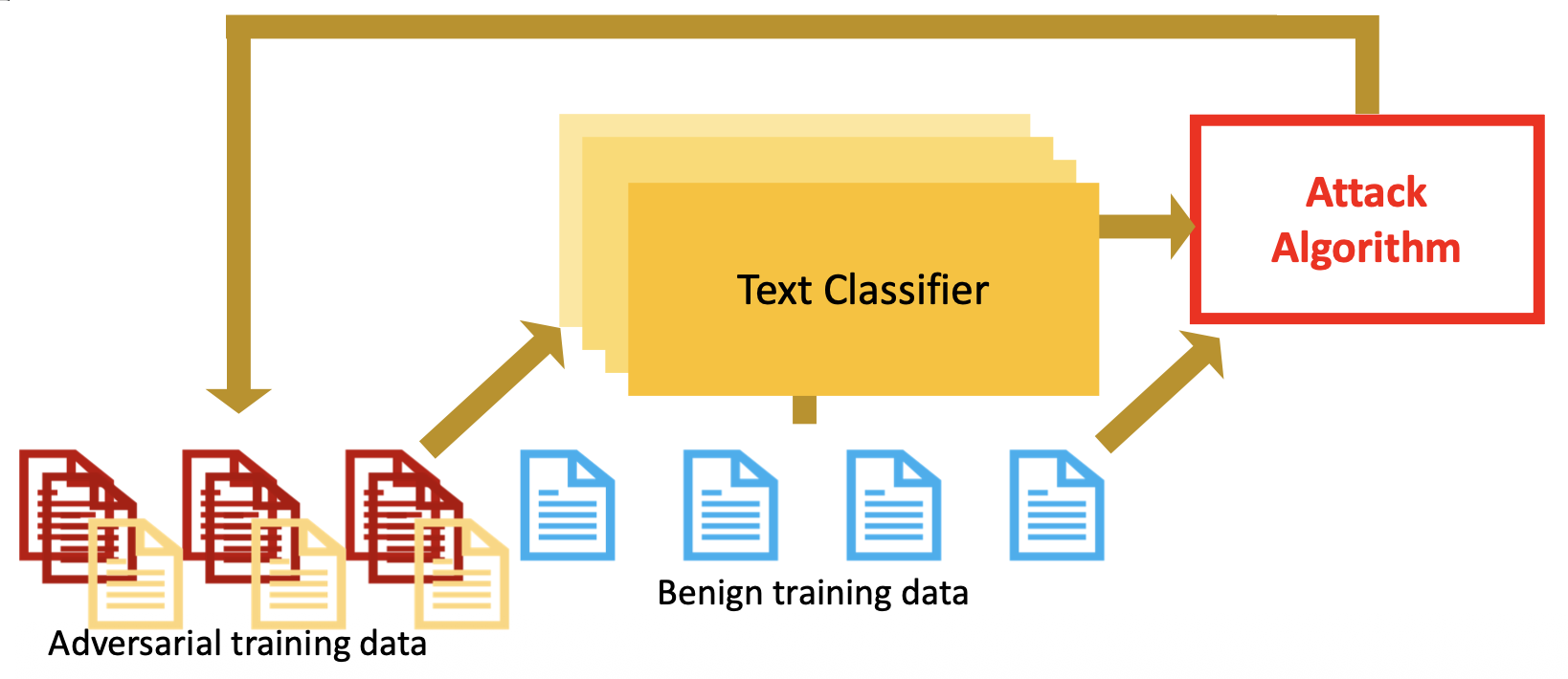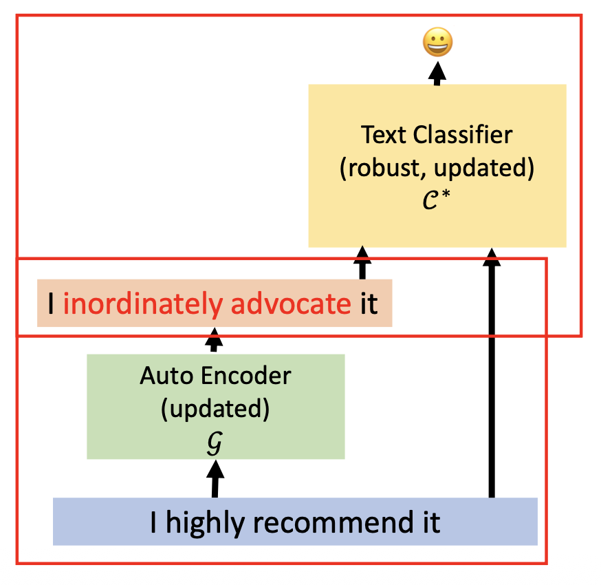 防御阶段(前两个式子保留原始语义;原文本和对抗样例同时喂给黄色的文本分类器训练)